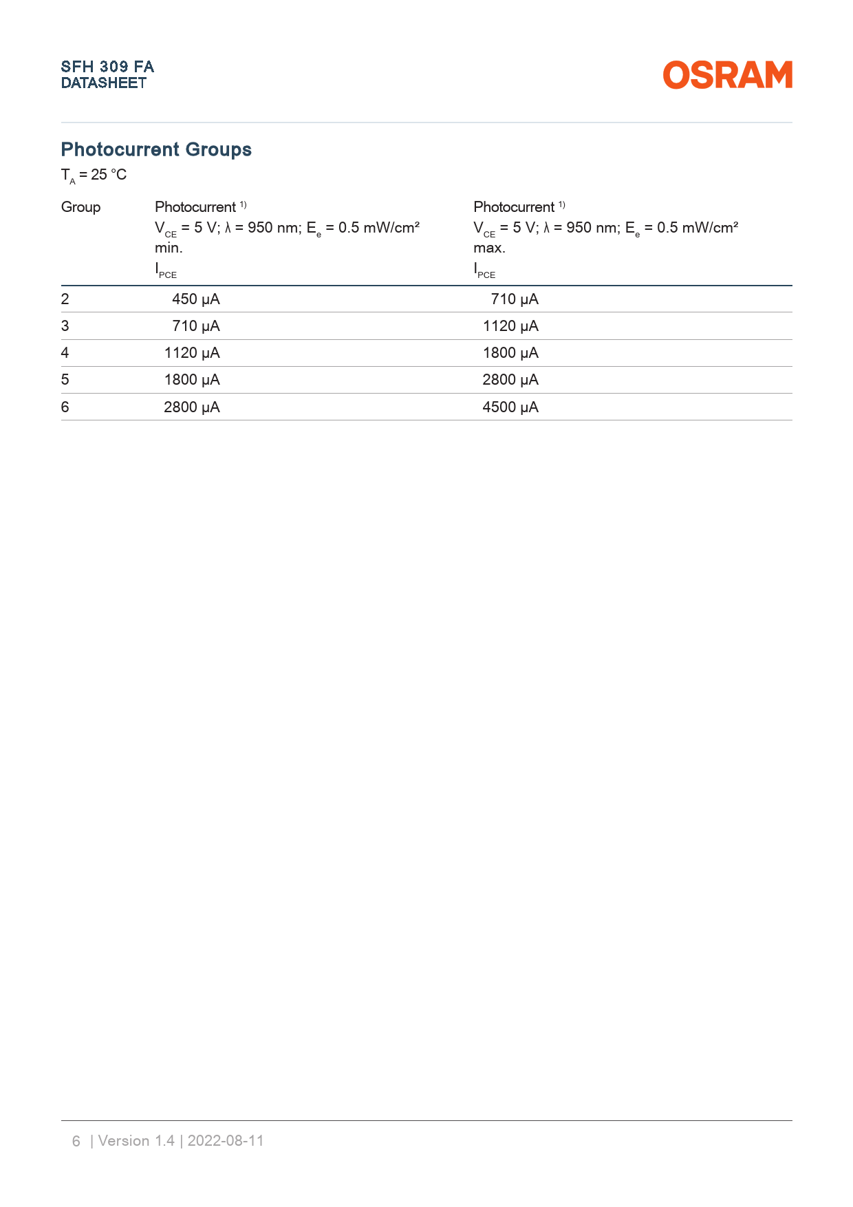 link. to. page. 14. link. to. page. 14. SFH. 309. FA. DATA. A. SHEET. Photocurrent. Groups. T. =. 25. °C. A. Group. Photocurrent. 1). Photocurrent. 1). V. =. 5. V;. λ. =. 950. nm;. E. =. 0.5