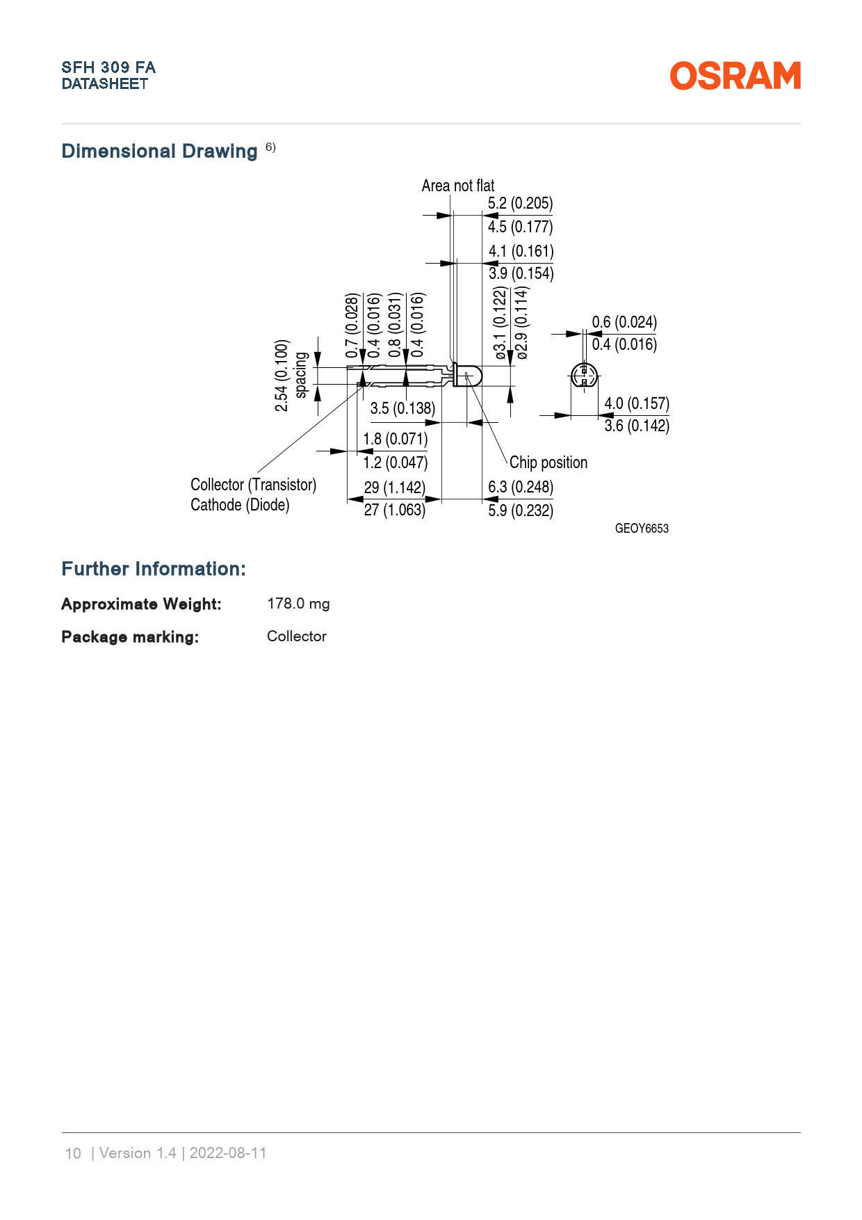 link to page 14 SFH 309 FA DATA A SHEET Dimensional Drawing 6) Area not flat5.2 (0.205) 4.5 (0.177) 4.1 (0.161) 3.9 (0.154) 0.6 (0.024) 0.4 (0.016) 0.7 (0.028) 0.4 (0.016) 0.8 (0.031) 0.4 (0.016) ø3.1 (0.122) ø2.9 (0.114) spacing 2.54 (0.100) 4.0 (0.157) 3.5 (0.138) 3.6 (0.142) 1.8 (0.071) 1.2 (0.047) Chip position Collector (Transistor) 29 (1.142) 6.3 (0.248) Cathode (Diode) 27 (1.063) 5.9 (0.232) GEOY6653 Further Information: Approximate Weight: 178.0 mg Package marking: Collector 10 | Version 1.4 | 2022-08-11