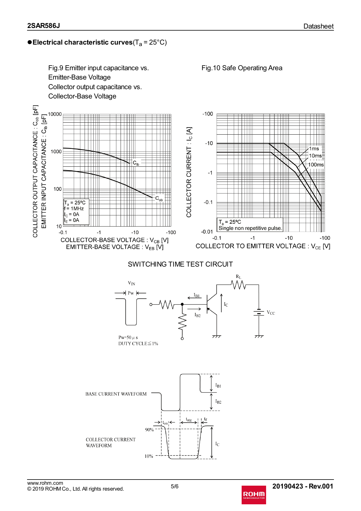 (Ta = 25°C) Fig.9 Emitter input capacitance vs. Fig.10 Safe Operating Area Emitter-Base Voltage Collector output capacitance vs. Collector-Base Voltage SWITCHING TIME TEST CIRCUIT www.rohm.com 5/6