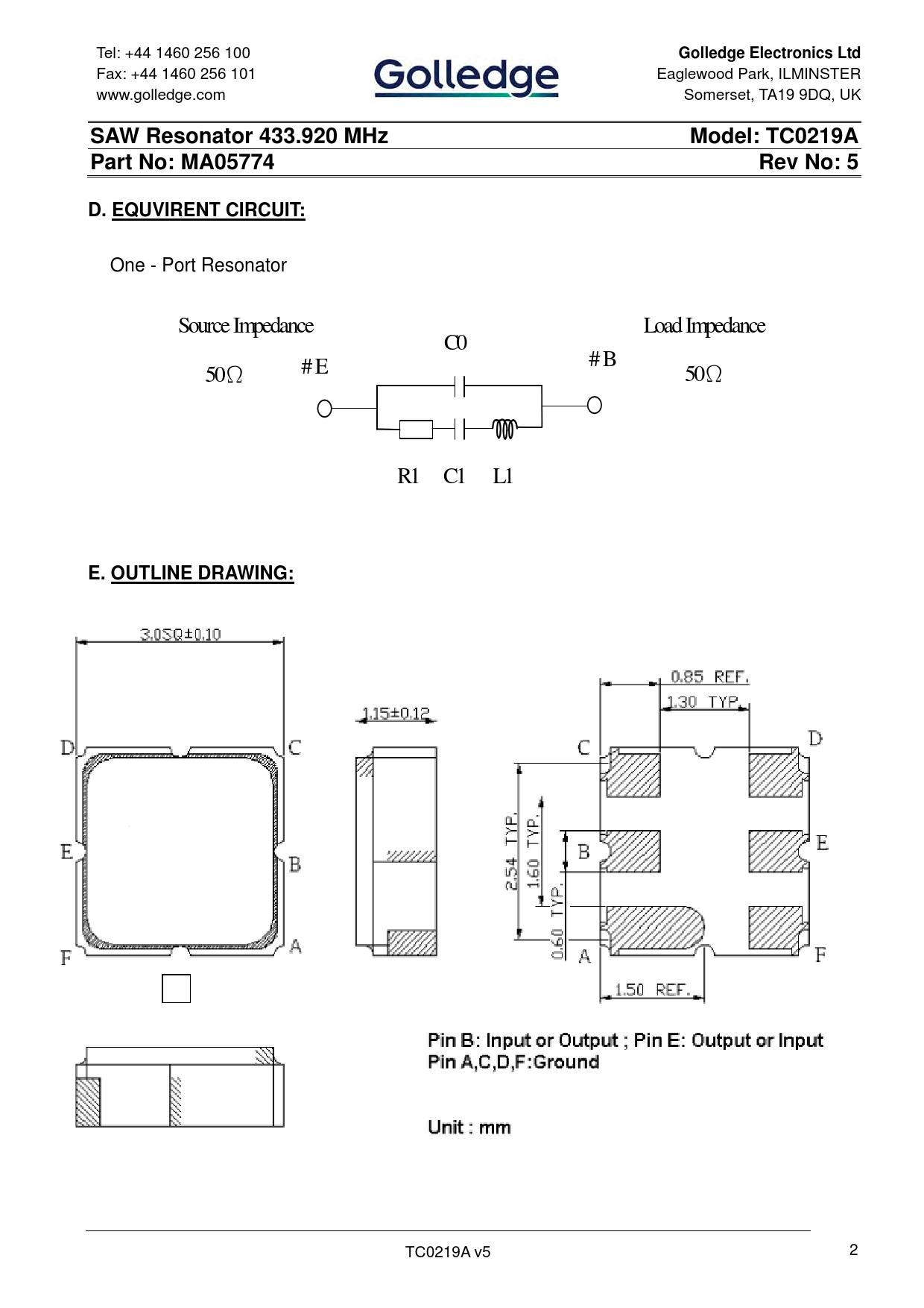 Golledge Electronics Ltd. SAW Resonator 433.920 MHz. Model: TC0219A. Part No: MA05774. Rev No: 5. D. EQUVIRENT CIRCUIT: