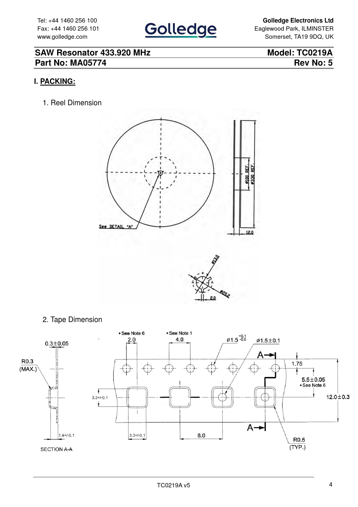 Golledge Electronics Ltd. SAW Resonator 433.920 MHz. Model: TC0219A. Part No: MA05774. Rev No: 5. I. PACKING: