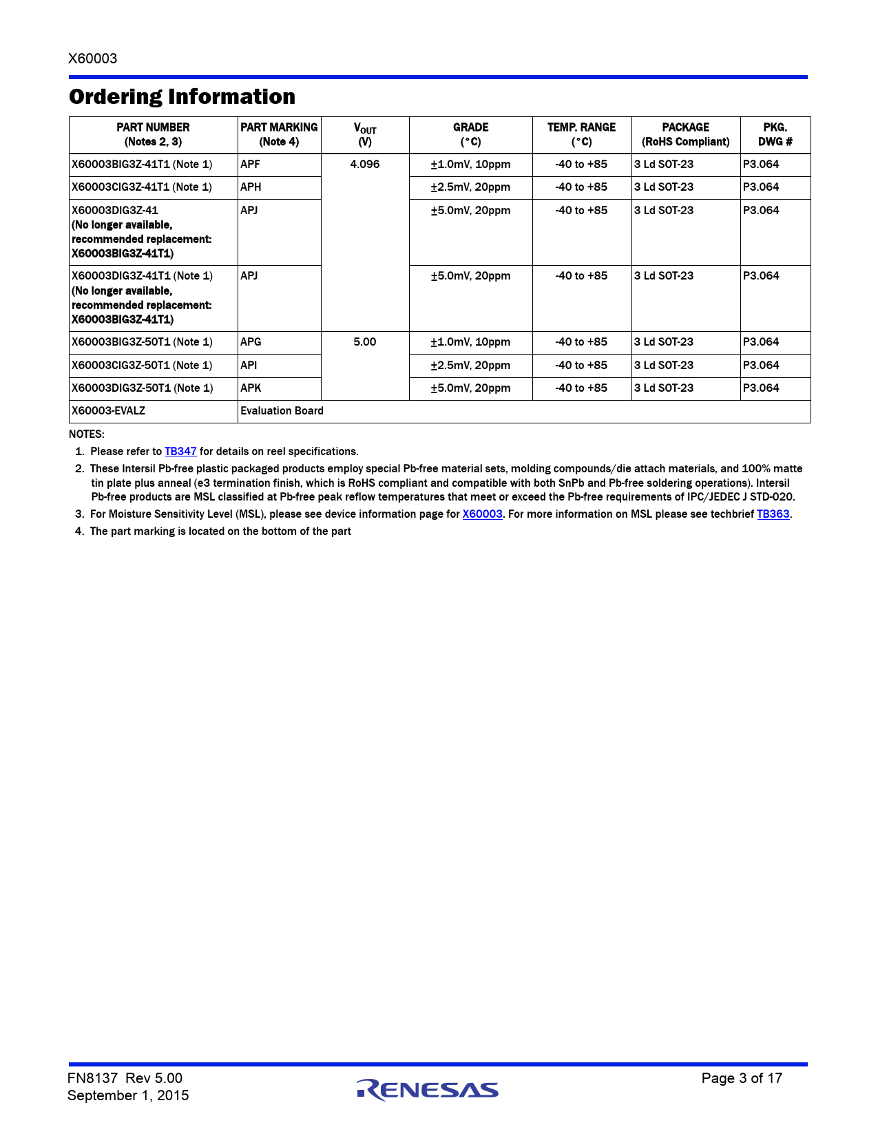 link to page 3 link to page 3 link to page 3 link to page 3 link to page 3 link to page 3 link to page 3 link to page 3 link to page 3 X60003 Ordering Information PART NUMBER PART MARKING VOUT GRADE TEMP. RANGE PACKAGE PKG. (Notes 2, 3) (Note 4) (V) (°C) (°C) (RoHS Compliant) DWG # X60003BIG3Z-41T1 (Note 1) APF 4.096 ±1.0mV, 10ppm -40 to +85 3 Ld SOT-23 P3.064 X60003CIG3Z-41T1 (Note 1) APH ±2.5mV, 20ppm -40 to +85 3 Ld SOT-23 P3.064 X60003DIG3Z-41 APJ ±5.0mV, 20ppm -40 to +85 3 Ld SOT-23 P3.064 (No longer available, recommended replacement: X60003BIG3Z-41T1) X60003DIG3Z-41T1 (Note 1) APJ ±5.0mV, 20ppm -40 to +85 3 Ld SOT-23 P3.064 (No longer available, recommended replacement: X60003BIG3Z-41T1) X60003BIG3Z-50T1 (Note 1) APG 5.00 ±1.0mV, 10ppm -40 to +85 3 Ld SOT-23 P3.064 X60003CIG3Z-50T1 (Note 1) API ±2.5mV, 20ppm -40 to +85 3 Ld SOT-23 P3.064 X60003DIG3Z-50T1 (Note 1) APK ±5.0mV, 20ppm -40 to +85 3 Ld SOT-23 P3.064 X60003-EVALZ Evaluation Board NOTES: 1. Please refer to TB347 for details on reel specifications. 2. These Intersil Pb-free plastic packaged products employ special Pb-free material sets, molding compounds/die attach materials, and 100% matte tin plate plus anneal (e3 termination finish, which is RoHS compliant and compatible with both SnPb and Pb-free soldering operations). Intersil Pb-free products are MSL classified at Pb-free peak reflow temperatures that meet or exceed the Pb-free requirements of IPC/JEDEC J STD-020. 3. For Moisture Sensitivity Level (MSL), please see device information page for X60003. For more information on MSL please see techbrief TB363. 4. The part marking is located on the bottom of the part FN8137 Rev 5.00 Page 3 of 17 September 1, 2015