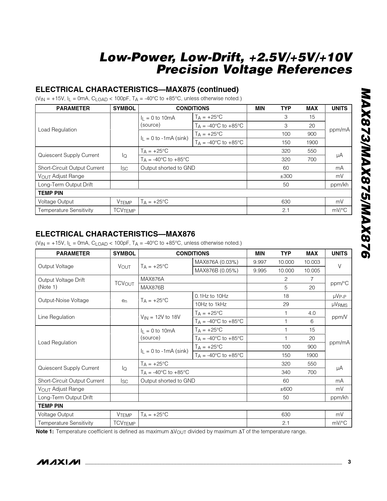 Low-Power, Low-Drift, +2.5V/+5V/+10VPrecision Voltage ReferencesMAX873/MAX875/MAX876ELECTRICAL CHARACTERISTICS—MAX875 (continued) (VIN = +15V, IL = 0mA, CLOAD < 100pF, TA = -40°C to +85°C, unless otherwise noted.) PARAMETERSYMBOLCONDITIONSMINTYPMAXUNITS I TA = +25°C 3 15 L = 0 to 10mA (source) TA = -40°C to +85°C 3 20 Load Regulation ppm/mA TA = +25°C 100 900 IL = 0 to -1mA (sink) TA = -40°C to +85°C 150 1900 TA = +25°C 320 550 Quiescent Supply Current IQ µA TA = -40°C to +85°C 320 700 Short-Circuit Output Current ISC Output shorted to GND 60 mA VOUT Adjust Range ±300 mV Long-Term Output Drift 50 ppm/kh TEMP PIN Voltage Output VTEMP TA = +25°C 630 mV Temperature Sensitivity TCVTEMP 2.1 mV/°C ELECTRICAL CHARACTERISTICS—MAX876 (VIN = +15V, IL = 0mA, CLOAD < 100pF, TA = -40°C to +85°C, unless otherwise noted.) PARAMETERSYMBOLCONDITIONSMINTYPMAXUNITS MAX876A (0.03%) 9.997 10.000 10.003 Output Voltage VOUT TA = +25°C V MAX876B (0.05%) 9.995 10.000 10.005 Output Voltage Drift MAX876A 2 7 TCVOUT ppm/°C (Note 1) MAX876B 5 20 0.1Hz to 10Hz 18 µVP-P Output-Noise Voltage en TA = +25°C 10Hz to 1kHz 29 µVRMS TA = +25°C 1 4.0 Line Regulation VIN = 12V to 18V ppm/V TA = -40°C to +85°C 1 6 I TA = +25°C 1 15 L = 0 to 10mA (source) TA = -40°C to +85°C 1 20 Load Regulation ppm/mA TA = +25°C 100 900 IL = 0 to -1mA (sink) TA = -40°C to +85°C 150 1900 TA = +25°C 320 550 Quiescent Supply Current IQ µA TA = -40°C to +85°C 340 700 Short-Circuit Output Current ISC Output shorted to GND 60 mA VOUT Adjust Range ±600 mV Long-Term Output Drift 50 ppm/kh TEMP PIN Voltage Output VTEMP TA = +25°C 630 mV Temperature Sensitivity TCVTEMP 2.1 mV/°C Note 1: Temperature coefficient is defined as maximum ∆VOUT divided by maximum ∆T of the temperature range. _______________________________________________________________________________________3