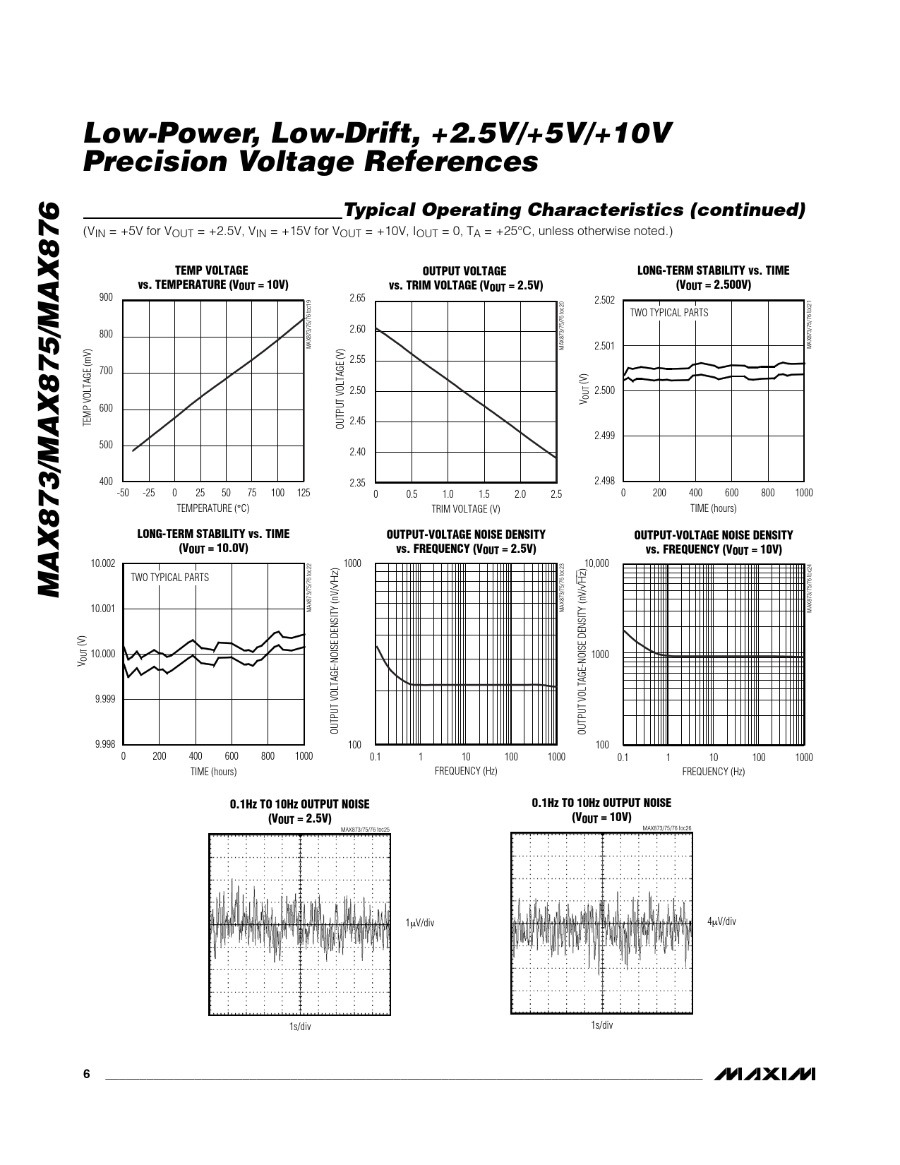Hz Hz √ √ 10.001 MAX873/75/76 toc22 MAX873/75/76 toc23 MAX873/75/76 toc24 (V) 10.000 1000 V OUT 9.999 OUTPUT VOLTAGE-NOISE DENSITY (nV/ OUTPUT VOLTAGE-NOISE DENSITY (nV/ 9.998 100 100 0 200 400 600 800 1000 0.1 1 10 100 1000 0.1 1 10 100 1000 TIME (hours) FREQUENCY (Hz) FREQUENCY (Hz)