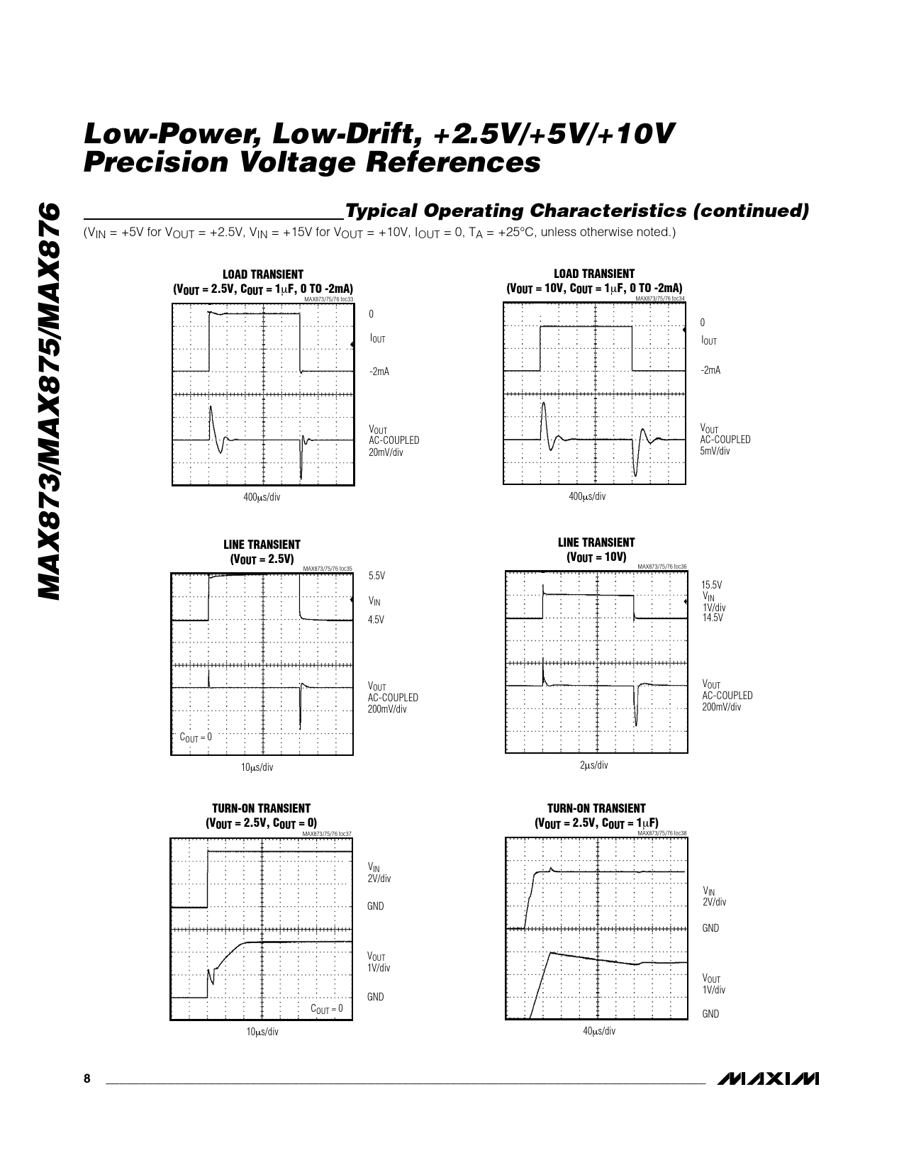 MAX873/75/76 toc37 MAX873/75/76 toc38 VIN 2V/div VIN GND 2V/div GND VOUT 1V/div VOUT 1V/div GND COUT = 0 GND 10µs/div 40µs/div