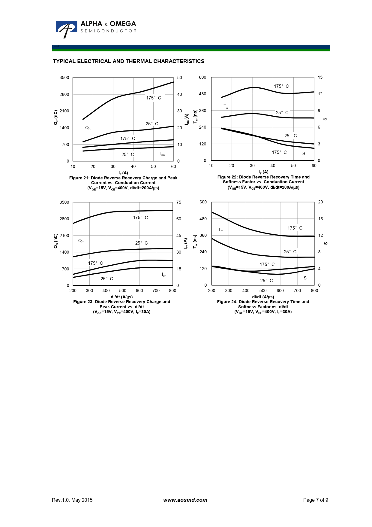 s) Figure 23: Diode Reverse Recovery Charge and Figure 24: Diode Reverse Recovery Time and Peak Current vs. di/dt Softness Factor vs. di/dt (V =15V, V =400V, I =30A) (V =15V, V =400V, I =30A) GE CE F GE CE F