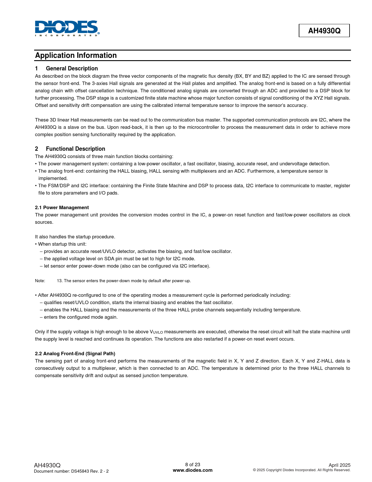 AH4930Q. Application Information. General Description. Functional Description. 2.1 Power Management