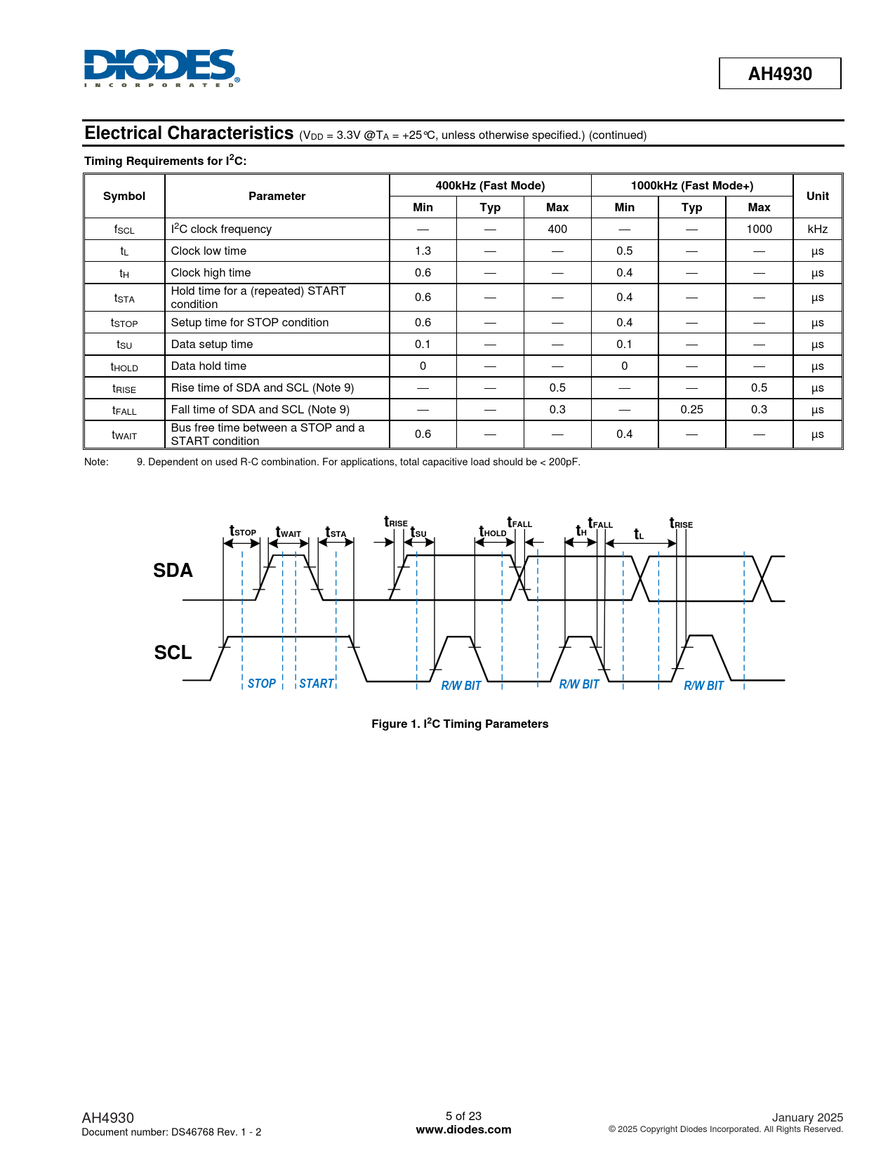 AH4930. Electrical Characteristics. Timing Requirements for I2C:. 400kHz (Fast Mode). 1000kHz (Fast Mode+). Symbol. Parameter. Unit