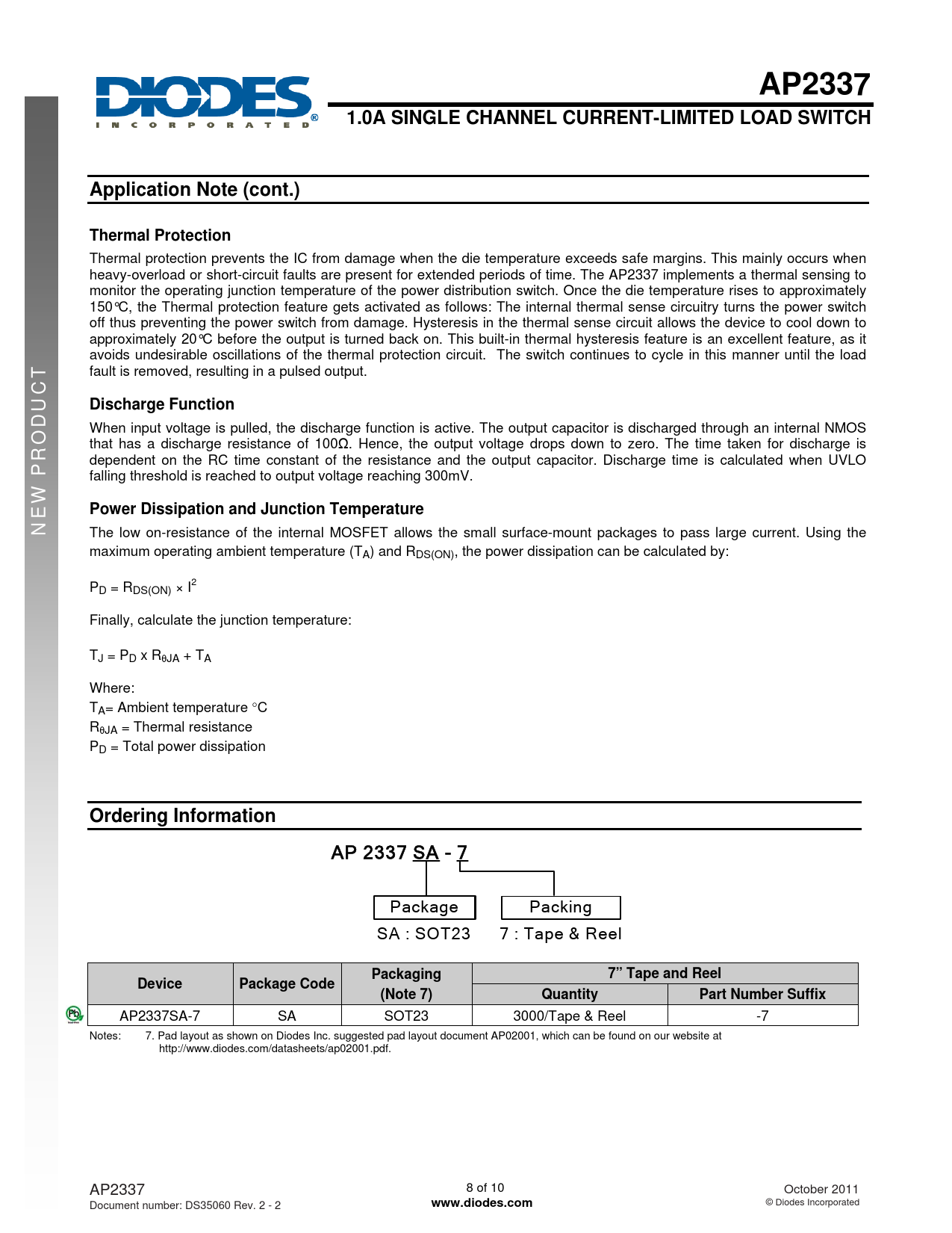 AP2337SA-7 SA SOT23 3000/Tape & Reel -7 Notes: 7. Pad layout as shown on Diodes Inc. suggested pad layout document AP02001, which can be found on our website at http://www.diodes.com/datasheets/ap02001.pdf. AP2337 8 of 10 October 2011 Document number: DS35060 Rev. 2 - 2