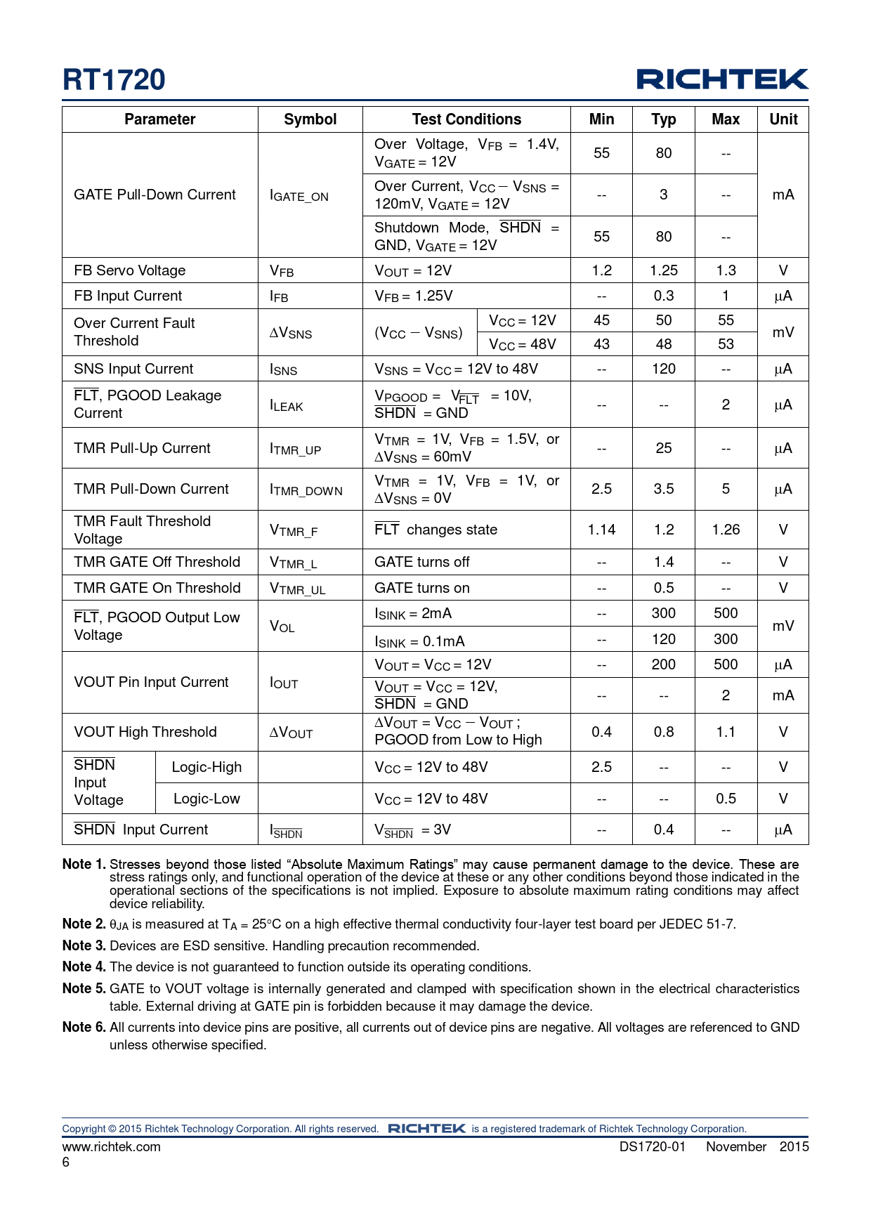 RT1720. Parameter. Symbol. Test Conditions. Min. Typ. Max. Unit. Note 1. Note 2. Note 3. Note 4. Note 5. Note 6