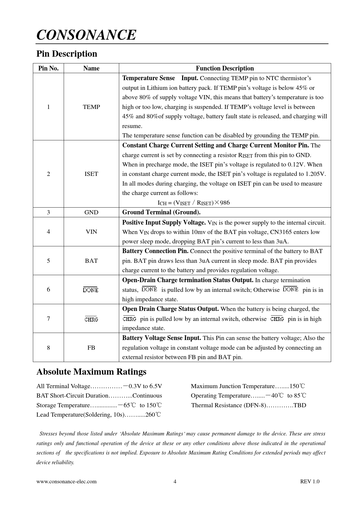 CONSONANCEPin DescriptionPin No.NameFunction DescriptionTemperature Sense Input. Connecting TEMP pin to NTC thermistor’s output in Lithium ion battery pack. If TEMP pin’s voltage is below 45% or above 80% of supply voltage VIN, this means that battery’s temperature is too 1 TEMP high or too low, charging is suspended. If TEMP’s voltage level is between 45% and 80%of supply voltage, battery fault state is released, and charging will resume. The temperature sense function can be disabled by grounding the TEMP pin. Constant Charge Current Setting and Charge Current Monitor Pin. The charge current is set by connecting a resistor RISET from this pin to GND. When in precharge mode, the ISET pin’s voltage is regulated to 0.12V. When 2 ISET in constant charge current mode, the ISET pin’s voltage is regulated to 1.205V. In all modes during charging, the voltage on ISET pin can be used to measure the charge current as follows: ICH = (VISET/RISET)×986 3 GND Ground Terminal (Ground).Positive Input Supply Voltage. VIN is the power supply to the internal circuit. 4 VIN When VIN drops to within 10mv of the BAT pin voltage, CN3165 enters low power sleep mode, dropping BAT pin’s current to less than 3uA. Battery Connection Pin. Connect the positive terminal of the battery to BAT 5 BAT pin. BAT pin draws less than 3uA current in sleep mode. BAT pin provides charge current to the battery and provides regulation voltage. Open-Drain Charge termination Status Output. In charge termination 6 status, is pulled low by an internal switch; Otherwise pin is in high impedance state. Open Drain Charge Status Output. When the battery is being charged, the 7 pin is pulled low by an internal switch, otherwise pin is in high impedance state. Battery Voltage Sense Input. This Pin can sense the battery voltage; Also the 8 FB regulation voltage in constant voltage mode can be adjusted by connecting an external resistor between FB pin and BAT pin. Absolute Maximum Ratings All Terminal Voltage……………-0.3V to 6.5V Maximum Junction Temperature…...150℃ BAT Short-Circuit Duration………...Continuous Operating Temperature…...-40℃ to 85℃ Storage Temperature…...-65℃ to 150℃ Thermal Resistance (DFN-8)………….TBD Lead Temperature(Soldering, 10s)……...260℃ Stresses beyond those listed under ‘Absolute Maximum Ratings’ may cause permanent damage to the device. These are stress ratings only and functional operation of the device at these or any other conditions above those indicated in the operational sections of the specifications is not implied. Exposure to Absolute Maximum Rating Conditions for extended periods may affect device reliability. www.consonance-elec.com 4 REV 1.0