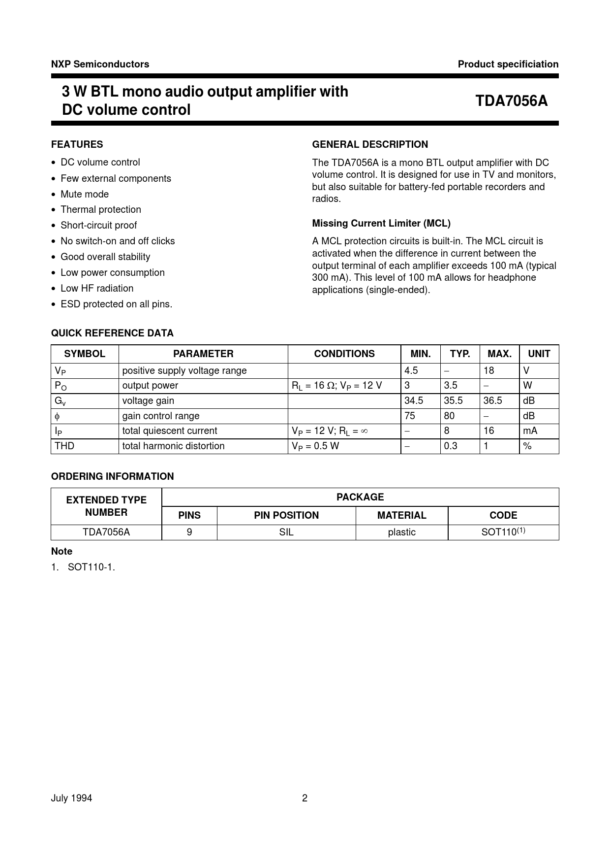 link to page 2 NXP SemiconductorsProduct specificiation3 W BTL mono audio output amplifier withTDA7056ADC volume controlFEATURESGENERAL DESCRIPTION • DC volume control The TDA7056A is a mono BTL output amplifier with DC • Few external components volume control. It is designed for use in TV and monitors, but also suitable for battery-fed portable recorders and • Mute mode radios. • Thermal protection • Short-circuit proof Missing Current Limiter (MCL) • No switch-on and off clicks A MCL protection circuits is built-in. The MCL circuit is • Good overall stability activated when the difference in current between the output terminal of each amplifier exceeds 100 mA (typical • Low power consumption 300 mA). This level of 100 mA allows for headphone • Low HF radiation applications (single-ended). • ESD protected on all pins. QUICK REFERENCE DATASYMBOLPARAMETERCONDITIONSMIN.TYP.MAX.UNIT VP positive supply voltage range 4.5 − 18 V PO output power RL = 16 Ω; VP = 12 V 3 3.5 − W Gv voltage gain 34.5 35.5 36.5 dB φ gain control range 75 80 − dB IP total quiescent current VP = 12 V; RL = ∞ − 8 16 mA THD total harmonic distortion VP = 0.5 W − 0.3 1 % ORDERING INFORMATIONEXTENDED TYPEPACKAGENUMBERPINSPIN POSITIONMATERIALCODE TDA7056A 9 SIL plastic SOT110(1) Note 1. SOT110-1. July 1994 2 Document Outline Features General description Missing Current Limiter (MCL) Quick reference data Ordering information Pinning Functional description Limiting values Thermal resistance Characteristics Application information Package outline Soldering Introduction Soldering by dipping or by wave Repairing soldered joints Data sheet status Disclaimers