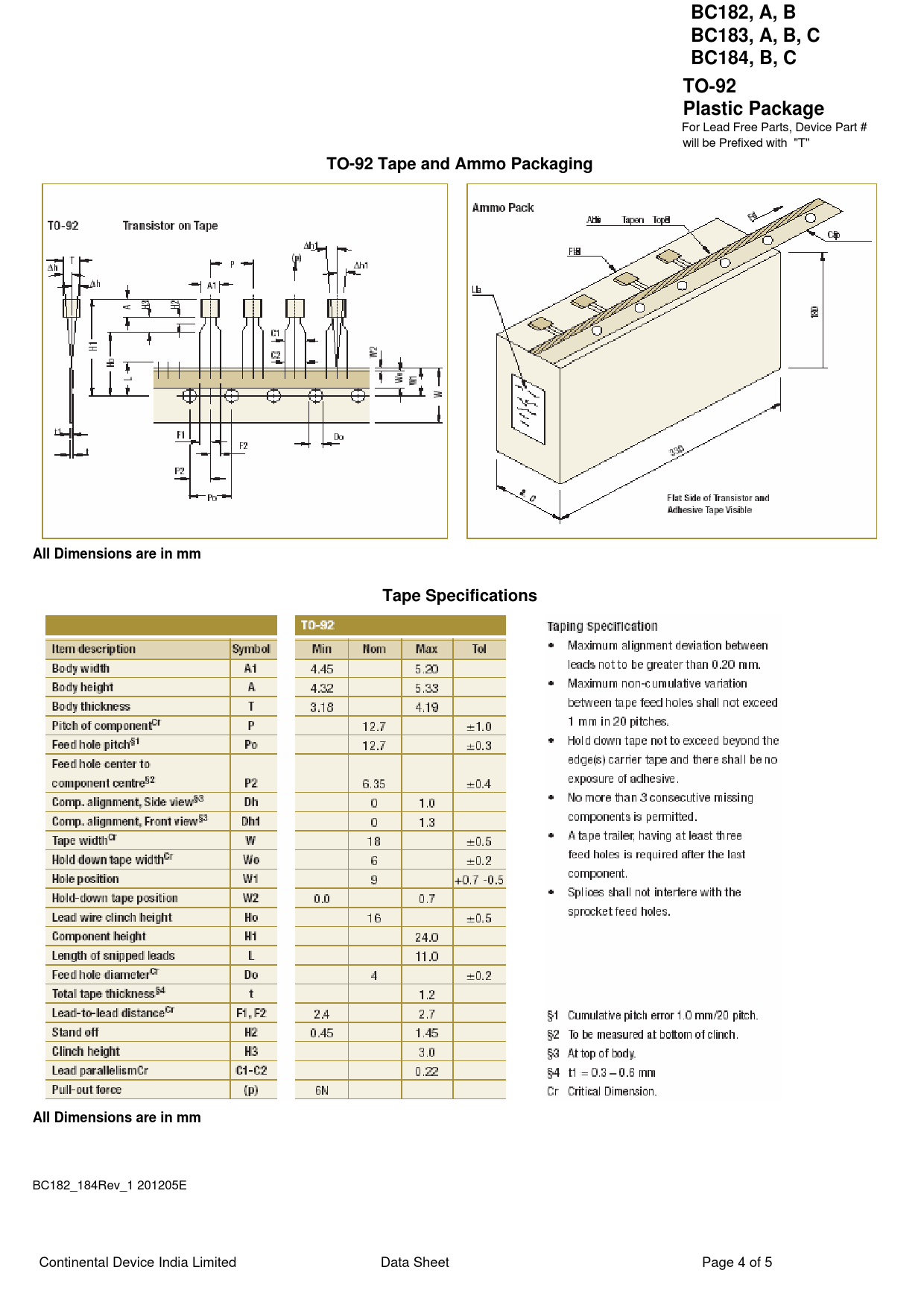 BC182, A, B BC183, A, B, C BC184, B, C. TO-92 Plastic Package. TO-92 Tape and Ammo Packaging. All Dimensions are in mm