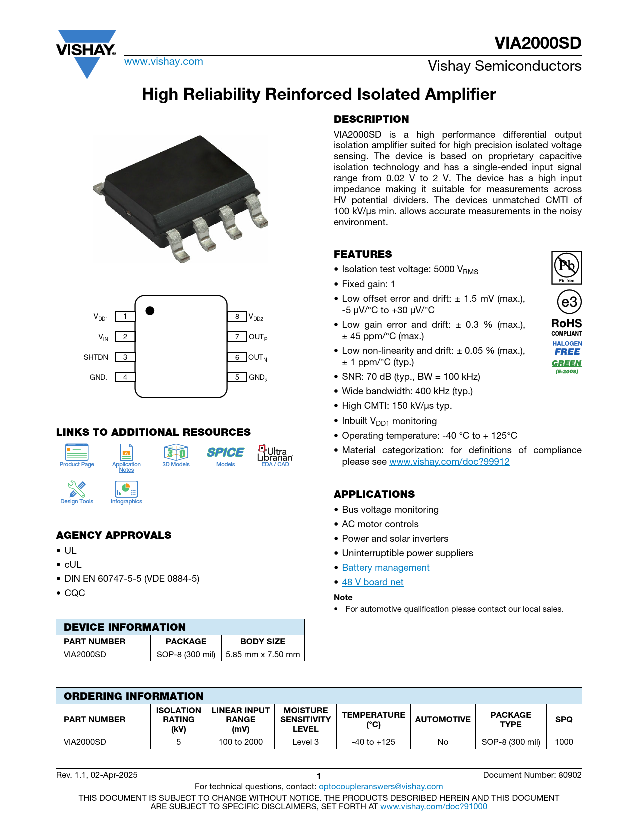 VIA2000SD www.vishay.com Vishay Semiconductors High Reliability Reinforced Isolated AmplifierDESCRIPTION VIA2000SD is a high performance differential output isolation amplifier suited for high precision isolated voltage sensing. The device is based on proprietary capacitive isolation technology and has a single-ended input signal range from 0.02 V to 2 V. The device has a high input impedance making it suitable for measurements across HV potential dividers. The devices unmatched CMTI of 100 kV/μs min. allows accurate measurements in the noisy environment. FEATURES • Isolation test voltage: 5000 VRMS • Fixed gain: 1 • Low offset error and drift: ± 1.5 mV (max.), -5 μV/°C to +30 μV/°C VDD1 1 8 VDD2 • Low gain error and drift: ± 0.3 % (max.), VIN 2 7 OUT ± 45 ppm/°C (max.) P • Low non-linearity and drift: ± 0.05 % (max.), SHTDN 3 6 OUTN ± 1 ppm/°C (typ.) GND1 4 5 GND • SNR: 70 dB (typ., BW = 100 kHz) 2 • Wide bandwidth: 400 kHz (typ.) • High CMTI: 150 kV/μs typ. • Inbuilt VDD1 monitoring LINKS TO ADDITIONAL RESOURCES • Operating temperature: -40 °C to + 125°C D 3 • Material categorization: for definitions of compliance 3 DProduct PageApplication3D ModelsModels please see www.vishay.com/doc?99912 EDA / CADNotesAPPLICATIONSDesign ToolsInfographics • Bus voltage monitoring • AC motor controls AGENCY APPROVALS • Power and solar inverters • UL • Uninterruptible power suppliers • cUL • Battery management • DIN EN 60747-5-5 (VDE 0884-5) • 48 V board net • CQC Note • For automotive qualification please contact our local sales. DEVICE INFORMATION PART NUMBERPACKAGEBODY SIZE VIA2000SD SOP-8 (300 mil) 5.85 mm x 7.50 mm ORDERING INFORMATIONISOLATIONLINEAR INPUTMOISTURETEMPERATUREPACKAGEPART NUMBERRATINGRANGESENSITIVITYAUTOMOTIVESPQ(°C)TYPE(kV)(mV)LEVEL VIA2000SD 5 100 to 2000 Level 3 -40 to +125 No SOP-8 (300 mil) 1000 Rev. 1.1, 02-Apr-2025 1 Document Number: 80902 For technical questions, contact: optocoupleranswers@vishay.com THIS DOCUMENT IS SUBJECT TO CHANGE WITHOUT NOTICE. THE PRODUCTS DESCRIBED HEREIN AND THIS DOCUMENT ARE SUBJECT TO SPECIFIC DISCLAIMERS, SET FORTH AT www.vishay.com/doc?91000