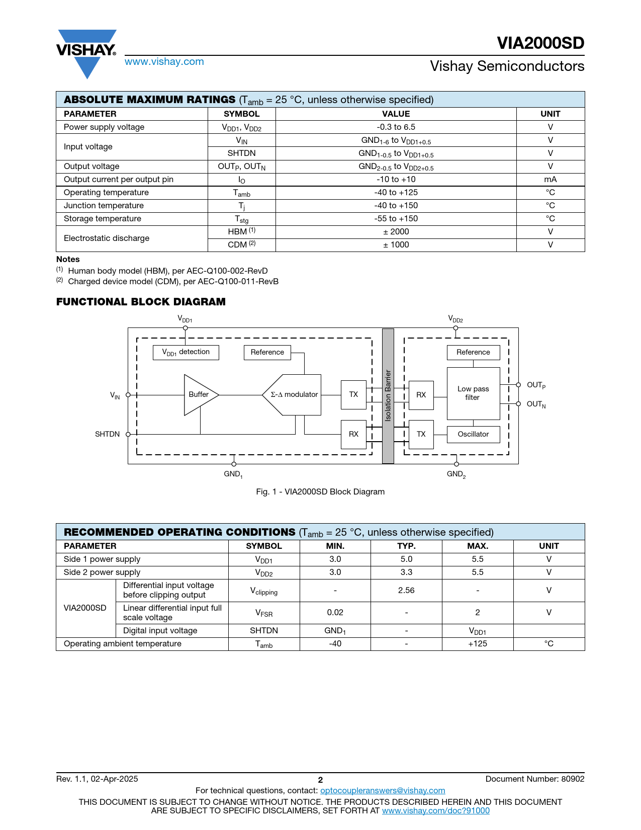 Side 1 power supply VDD1 3.0 5.0 5.5 V Side 2 power supply VDD2 3.0 3.3 5.5 V Differential input voltage V before clipping output clipping - 2.56 - V VIA2000SD Linear differential input full V scale voltage FSR 0.02 - 2 V Digital input voltage SHTDN GND1 - VDD1 Operating ambient temperature Tamb -40 - +125 °C Rev. 1.1, 02-Apr-2025