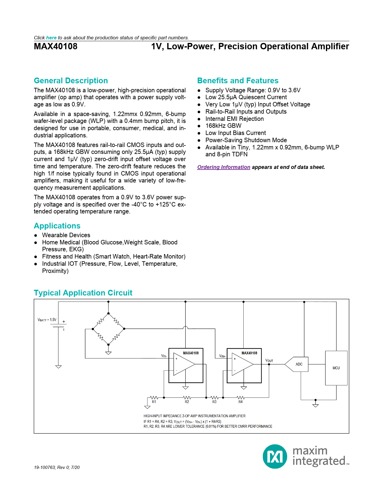 here. MAX40108. 1V, Low-Power, Precision Operational Amplifier. General Description. Benefits and Features. Ordering Information