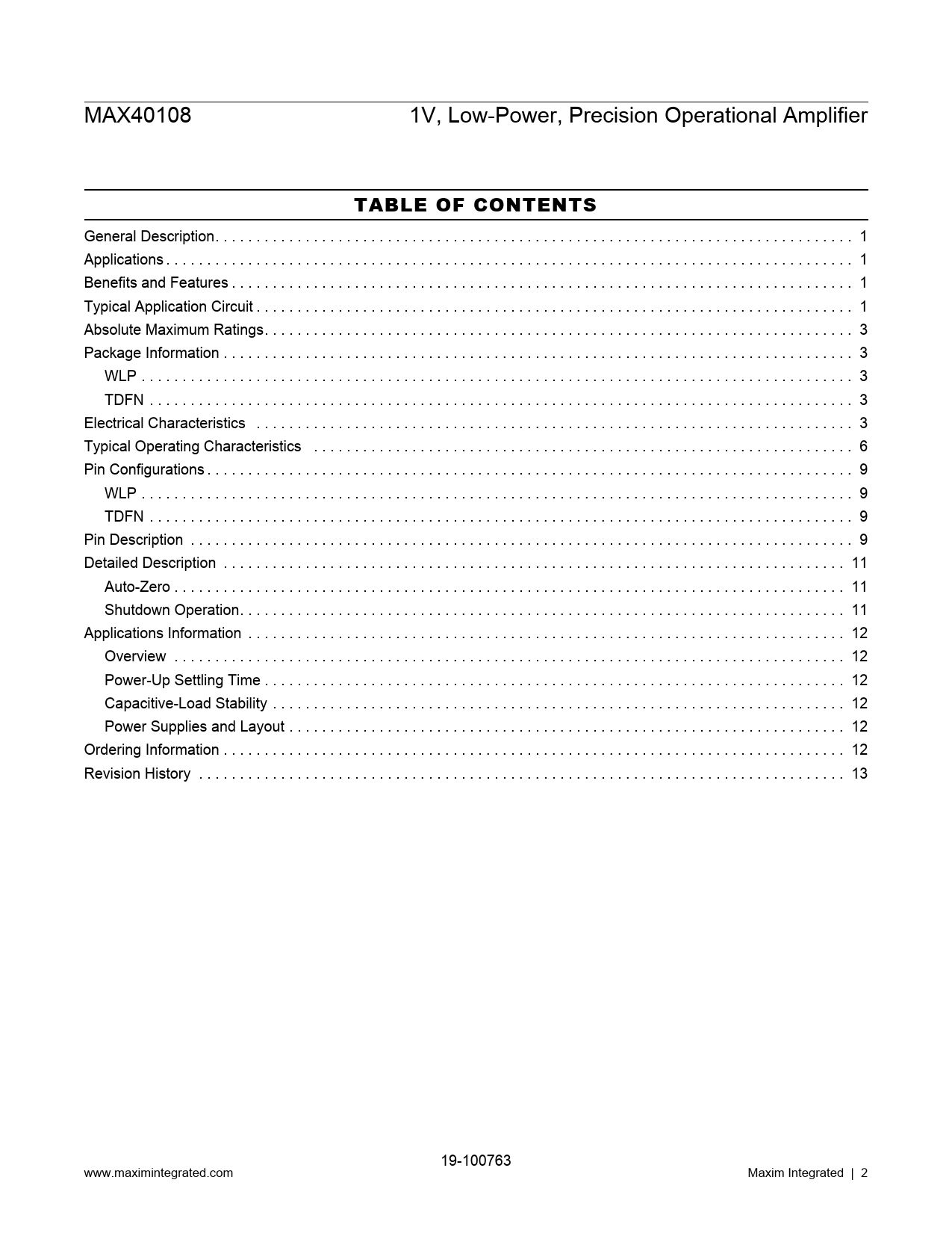 link to page 1 link to page 1 link to page 1 link to page 1 link to page 3 link to page 3 link to page 3 link to page 3 link to page 3 link to page 6 link to page 9 link to page 9 link to page 9 link to page 9 link to page 11 link to page 11 link to page 11 link to page 12 link to page 12 link to page 12 link to page 12 link to page 12 link to page 12 link to page 13 MAX40108 1V, Low-Power, Precision Operational Amplifier TABLE OF CONTENTS General Description. 1 Applications . 1 Benefits and Features . 1 Typical Application Circuit . 1 Absolute Maximum Ratings. 3 Package Information . 3 WLP . 3 TDFN . 3 Electrical Characteristics . 3 Typical Operating Characteristics . 6 Pin Configurations . 9 WLP . 9 TDFN . 9 Pin Description . 9 Detailed Description . 11 Auto-Zero . 11 Shutdown Operation. 11 Applications Information . 12 Overview . 12 Power-Up Settling Time . 12 Capacitive-Load Stability . 12 Power Supplies and Layout . 12 Ordering Information . 12 Revision History . 13 19-100763 www.maximintegrated.com Maxim Integrated | 2 Document Outline General Description Applications Benefits and Features Typical Application Circuit Absolute Maximum Ratings Package Information WLP TDFN Electrical Characteristics Electrical Characteristics (continued) Typical Operating Characteristics Typical Operating Characteristics (continued) Pin Configurations WLP TDFN Pin Description Pin Description (continued) Detailed Description Auto-Zero Shutdown Operation Applications Information Overview Power-Up Settling Time Capacitive-Load Stability Power Supplies and Layout Ordering Information Revision History
