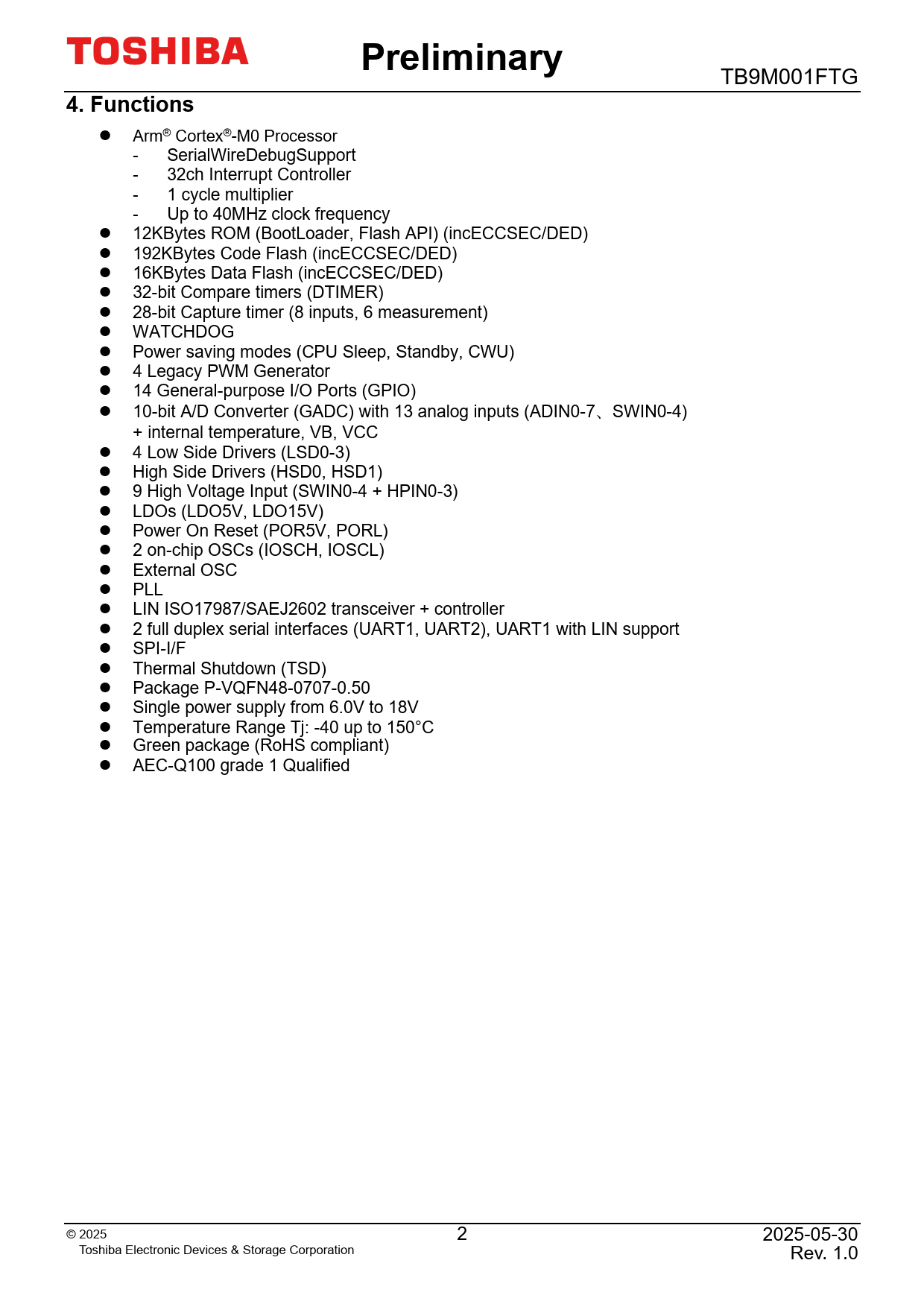 Arm® Cortex®-M0 Processor - SerialWireDebugSupport - 32ch Interrupt Controller - 1 cycle multiplier - Up to 40MHz clock frequency 12KBytes ROM (BootLoader, Flash API) (incECCSEC/DED) 192KBytes Code Flash (incECCSEC/DED) 16KBytes Data Flash (incECCSEC/DED) 32-bit Compare timers (DTIMER) 28-bit Capture timer (8 inputs, 6 measurement) WATCHDOG Power saving modes (CPU Sleep, Standby, CWU) 4 Legacy PWM Generator 14 General-purpose I/O Ports (GPIO) 10-bit A/D Converter (GADC) with 13 analog inputs (ADIN0-7、SWIN0-4) + internal temperature, VB, VCC 4 Low Side Drivers (LSD0-3) High Side Drivers (HSD0, HSD1) 9 High Voltage Input (SWIN0-4 + HPIN0-3) LDOs (LDO5V, LDO15V) Power On Reset (POR5V, PORL) 2 on-chip OSCs (IOSCH, IOSCL) External OSC PLL LIN ISO17987/SAEJ2602 transceiver + controller 2 full duplex serial interfaces (UART1, UART2), UART1 with LIN support SPI-I/F Thermal Shutdown (TSD) Package P-VQFN48-0707-0.50 Single power supply from 6.0V to 18V Temperature Range Tj: -40 up to 150°C Green package (RoHS compliant) AEC-Q100 grade 1 Qualified © 2 025 2 2025-05-30 Toshiba Electronic Devices & Storage Corporation Rev. 1.0 Document Outline 1. Description 2. Applications 3. Features 4. Functions 5. Block Diagram 6. Pin Assignments 7. Pin Description 8. I/O Equivalent Circuits 9. Functional Description 9.1. CPU 9.1.1. Overview 9.1.2. Arm® Cortex®-M0 Processor 9.1.3. Configurable Options 9.1.4. External Signals 9.1.5. Module Organization 9.2. LINPHY 9.3. LINCNT/UART1 9.4. SPI 9.4.1. External Signals 9.5. GPIO 9.6. 10bit Analog Digital Converter (GADC) 9.7. Low Side Drivers (LSD) 9.8. High Side Drivers (HSD) 9.9. High Voltage Inputs (HVIF) 9.10. Memory Map 10. Electrical Characteristics 10.1. Absolute Maximum Ratings 10.2. Operating Ranges 10.3. Overall Electrical Characteristics 10.4. 5-V/1.5-V Regulator (LDO5V/LDO15V) 10.5. Switch and Hall Sensor IC Inputs(High Voltage Inputs) 10.6. Oscillator 10.7. Reset Generator and Standby Time 10.8. Data Flash 10.9. Program Flash 10.10. LIN 10.11. 12-V High-Side Driver (HSD_VB) 10.12. 5-V High-Side Driver (HSD_VCC) 10.13. Low-Side Drivers 10.14. 10-Bit AD 10.15. DC characteristics 10.16. SPI 10.17. UART 11. Application Circuit Example 12. Package Information 12.1. Package Dimensions 12.2. Marking 13. IC Usage Considerations 13.1. Notes on Handling of ICs 13.2. Points to Remember on Handling of ICs RESTRICTIONS ON PRODUCT USE