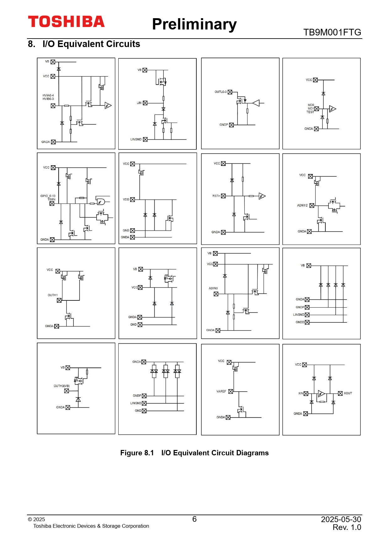 © 2 025 6 2025-05-30 Toshiba Electronic Devices & Storage Corporation Rev. 1.0 Document Outline 1. Description 2. Applications 3. Features 4. Functions 5. Block Diagram 6. Pin Assignments 7. Pin Description 8. I/O Equivalent Circuits 9. Functional Description 9.1. CPU 9.1.1. Overview 9.1.2. Arm® Cortex®-M0 Processor 9.1.3. Configurable Options 9.1.4. External Signals 9.1.5. Module Organization 9.2. LINPHY 9.3. LINCNT/UART1 9.4. SPI 9.4.1. External Signals 9.5. GPIO 9.6. 10bit Analog Digital Converter (GADC) 9.7. Low Side Drivers (LSD) 9.8. High Side Drivers (HSD) 9.9. High Voltage Inputs (HVIF) 9.10. Memory Map 10. Electrical Characteristics 10.1. Absolute Maximum Ratings 10.2. Operating Ranges 10.3. Overall Electrical Characteristics 10.4. 5-V/1.5-V Regulator (LDO5V/LDO15V) 10.5. Switch and Hall Sensor IC Inputs(High Voltage Inputs) 10.6. Oscillator 10.7. Reset Generator and Standby Time 10.8. Data Flash 10.9. Program Flash 10.10. LIN 10.11. 12-V High-Side Driver (HSD_VB) 10.12. 5-V High-Side Driver (HSD_VCC) 10.13. Low-Side Drivers 10.14. 10-Bit AD 10.15. DC characteristics 10.16. SPI 10.17. UART 11. Application Circuit Example 12. Package Information 12.1. Package Dimensions 12.2. Marking 13. IC Usage Considerations 13.1. Notes on Handling of ICs 13.2. Points to Remember on Handling of ICs RESTRICTIONS ON PRODUCT USE
