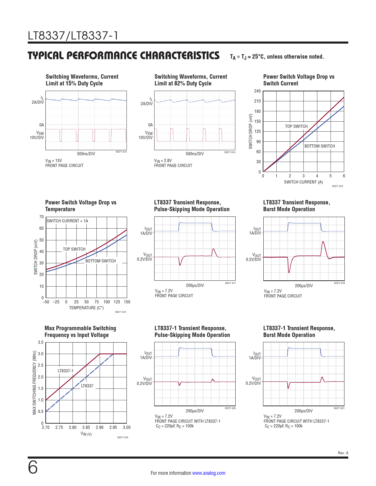 Power Switch Voltage Drop vs LT8337 Transient Response, LT8337 Transient Response, Temperature Switch Current Pulse-Skipping Mode Operation Burst Mode Operation