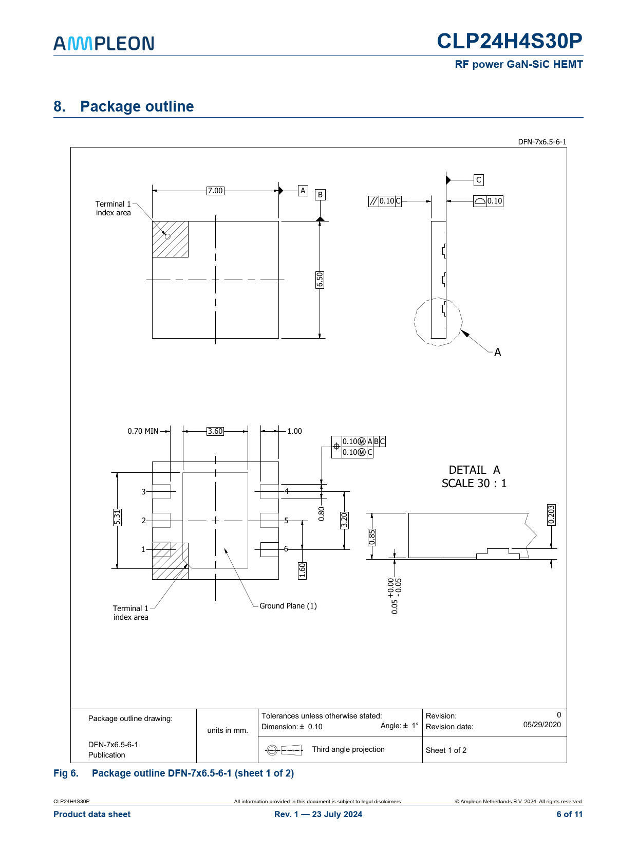 DFN-7x6.5-6-1 C 7.00 A B Terminal 1 H 0.10 C F 0.10 index area 0 5.6 A 0.70 MIN 3.60 1.00 0.10O A B C L 0.10O C DETAIL A SCALE 30 : 1 3 4 3 1 0 0 3 8. 0 . 0 2 2. 5 2 5 . 3 0 5 8.0 1 6 0 6.1 0 5 0 0 . 0 0 + -5 Terminal 1 Ground Plane (1) 0.0 index area 0 Package outline drawing: Tolerances unless otherwise stated: Revision: Dimension: B 0.10 Angle: B 1° Revision date: 05/29/2020 units in mm. DFN-7x6.5-6-1 Third angle projection Sheet 1 of 2 Publication