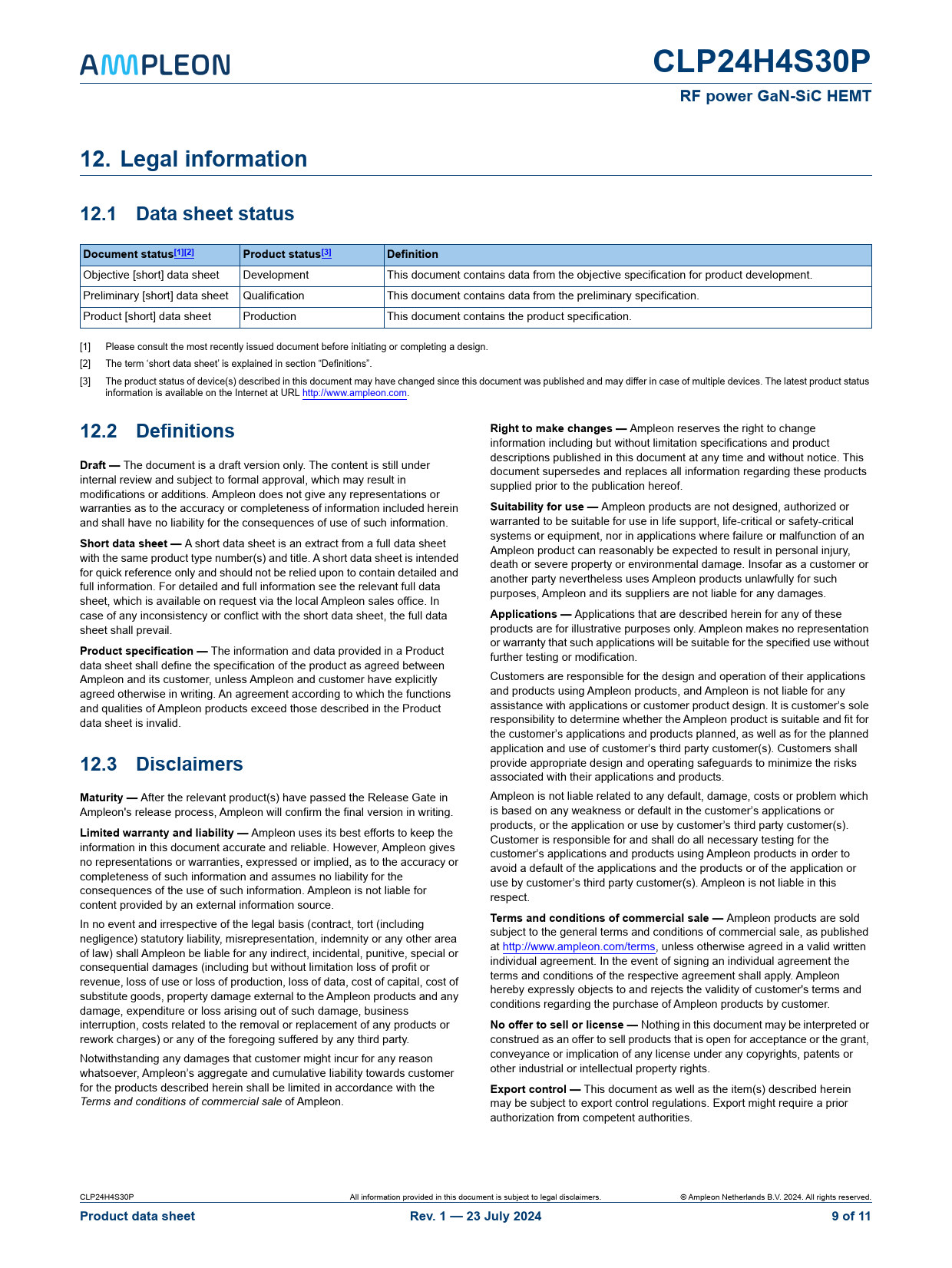 CLP24H4S30P RF power GaN-SiC HEMT 12. Legal information 12.1 Data sheet status Document status[1][2] Product status[3] Definition