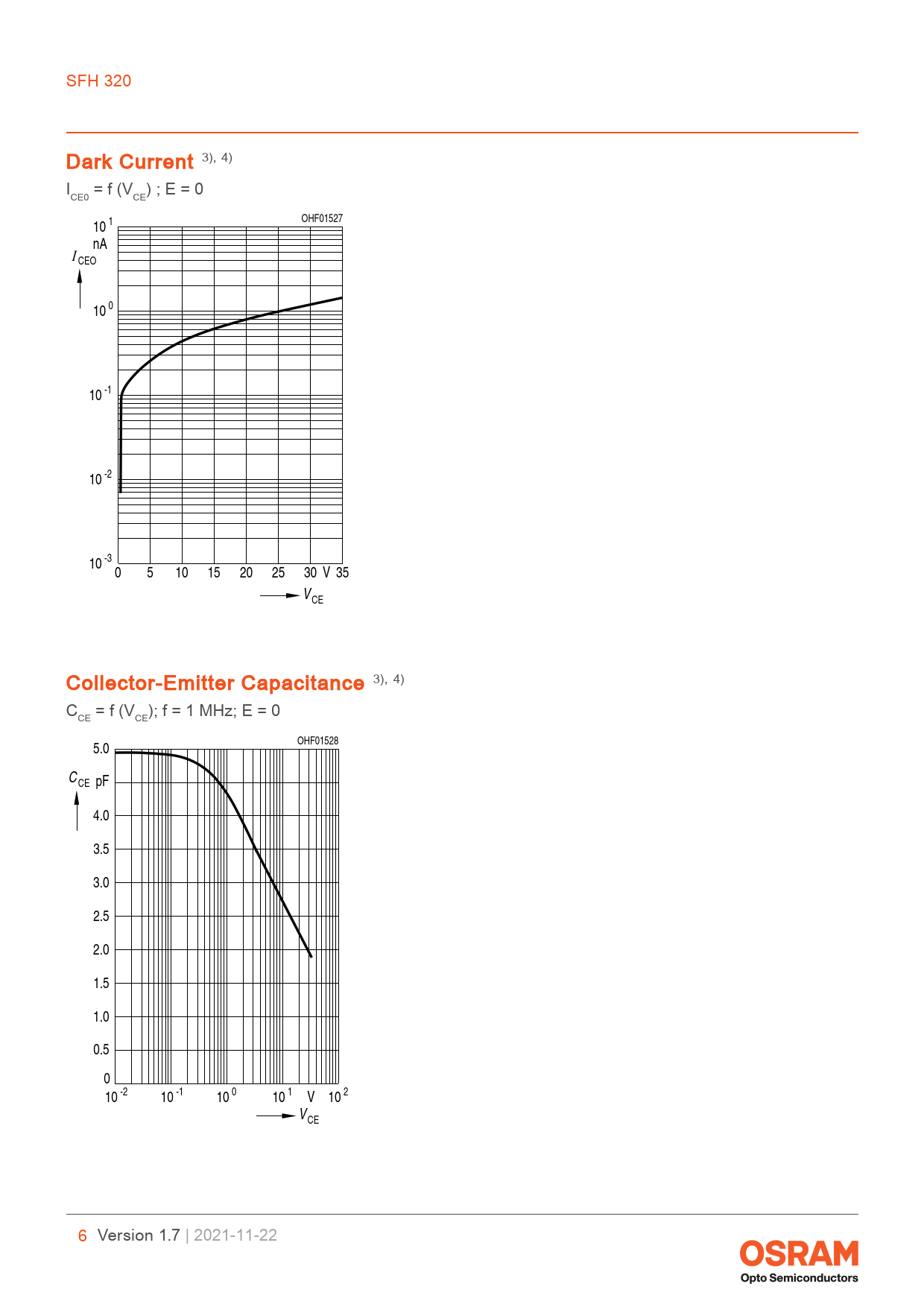 link to page 16 link to page 16 link to page 16 link to page 16 SFH 320 Dark Current 3), 4) I = f (V ) ; E = 0 CE0 CE OHF01527 10 1 nA Ι CEO 10 0 10 -1 10 -2 -3 10 0 5 10 15 20 25 30 V 35 VCE Collector-Emitter Capacitance 3), 4) C = f (V ); f = 1 MHz; E = 0 CE CE OHF01528 5.0 CCE pF 4.0 3.5 3.0 2.5 2.0 1.5 1.0 0.5 0 -2 10 10 -1 10 0 10 1 V 10 2 VCE 6 Version 1.7 | 2021-11-22