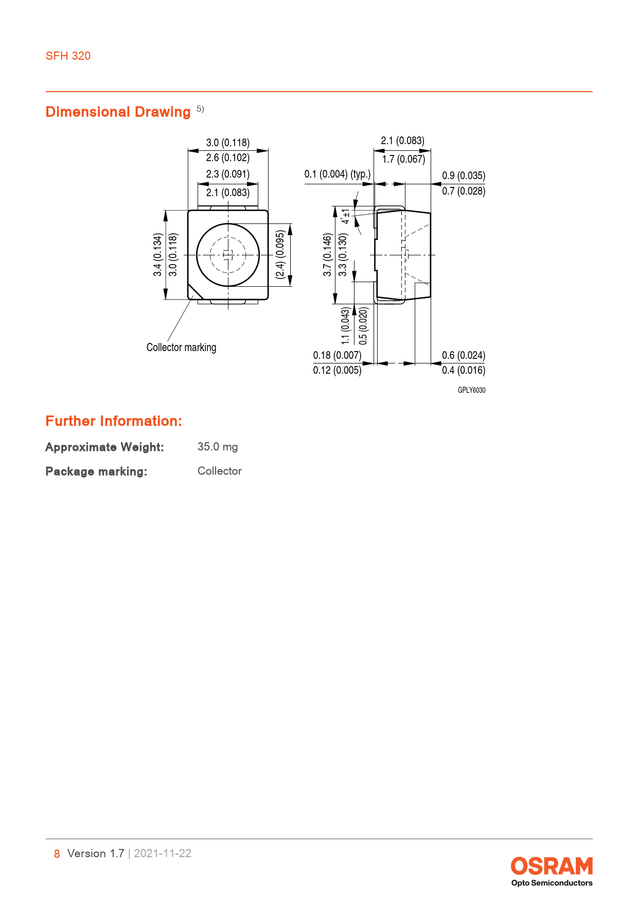 link. to. page. 16. SFH. 320. Dimensional. Drawing. 5). 3.0. (0.118). 2.1. (0.083). 2.6. (0.102). 1.7. (0.067). 2.3. (0.091). 0.1. (0.004). (typ.). 0.9. (0.035). 2.1