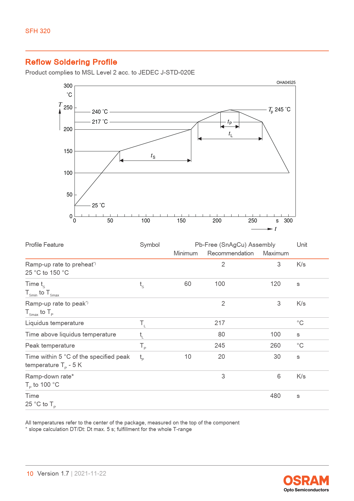 SFH. 320. Reflow. Soldering. Profile. Product. complies. to. MSL. Level. 2. acc. to. JEDEC. J-STD-020E. OHA04525. 300. ˚C. T. 250. T. 240. ˚C. p. 245. ˚C. 217. ˚C. tP. 200. tL. 150