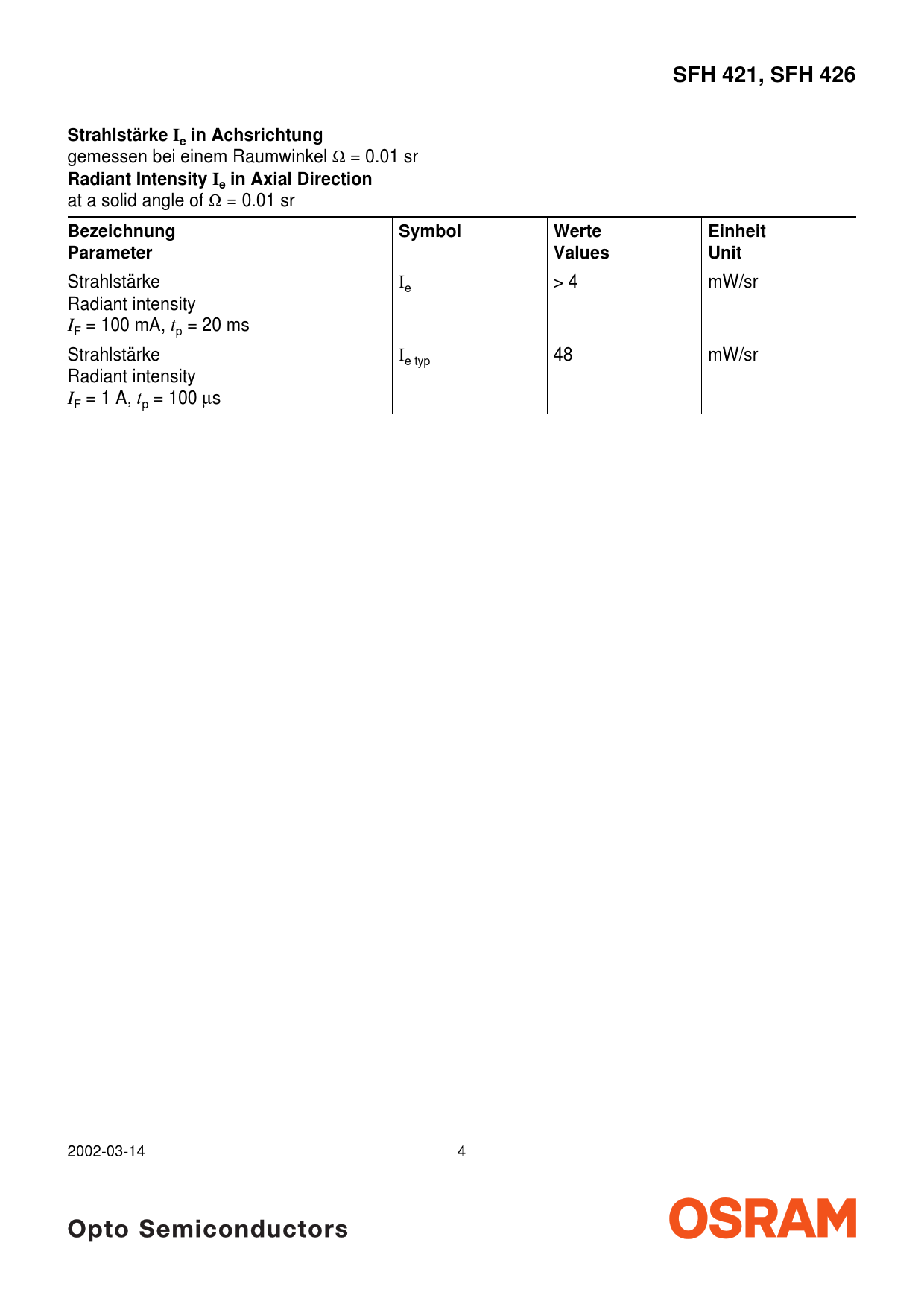 SFH 421, SFH 426. Strahlstärke I in Achsrichtung. Radiant Intensity I in Axial Direction. Bezeichnung. Symbol. Werte. Einheit