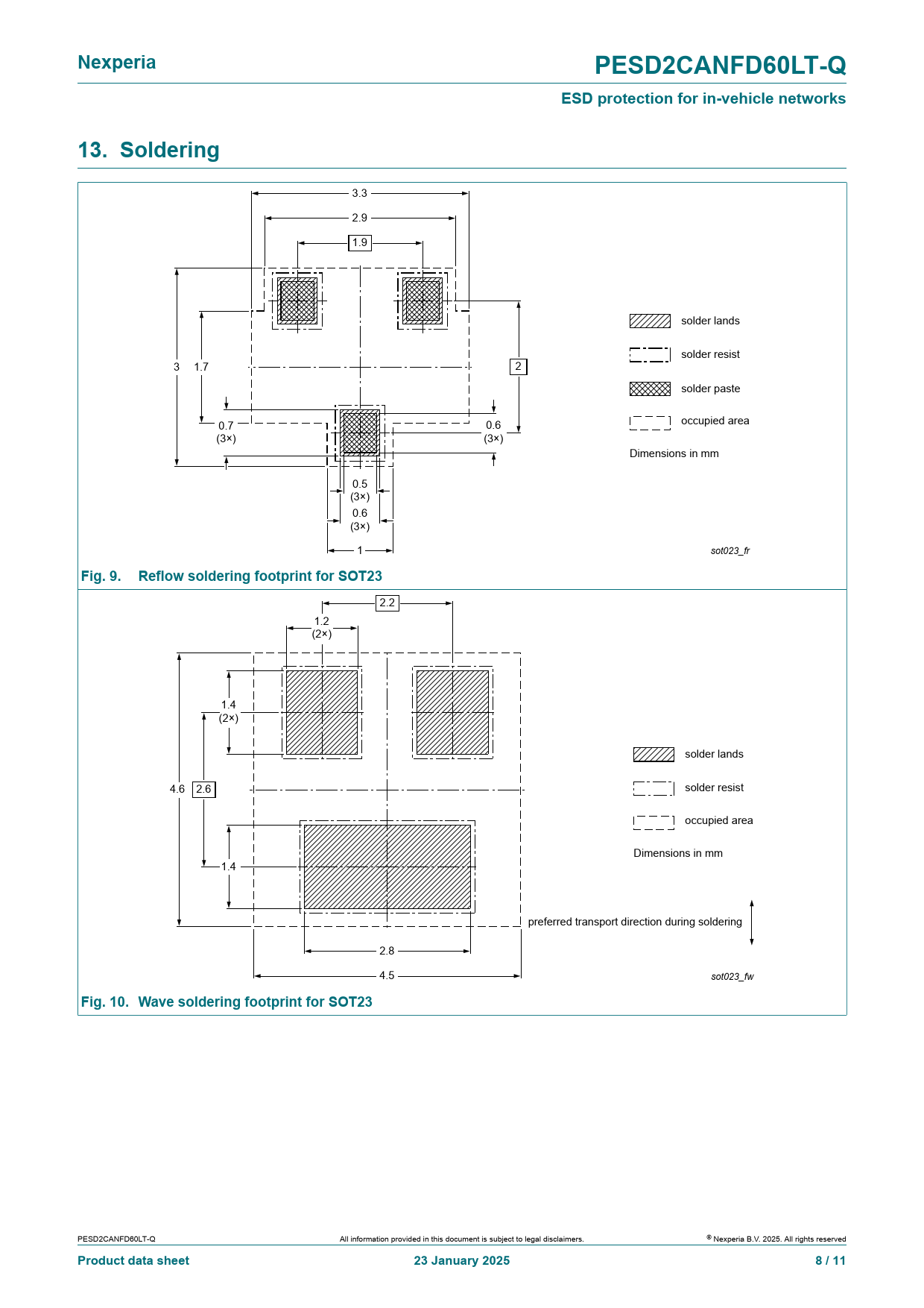 Nexperia. PESD2CANFD60LT-Q. ESD protection for in-vehicle networks. 13. Soldering. Fig. 9. Reflow soldering footprint for SOT23