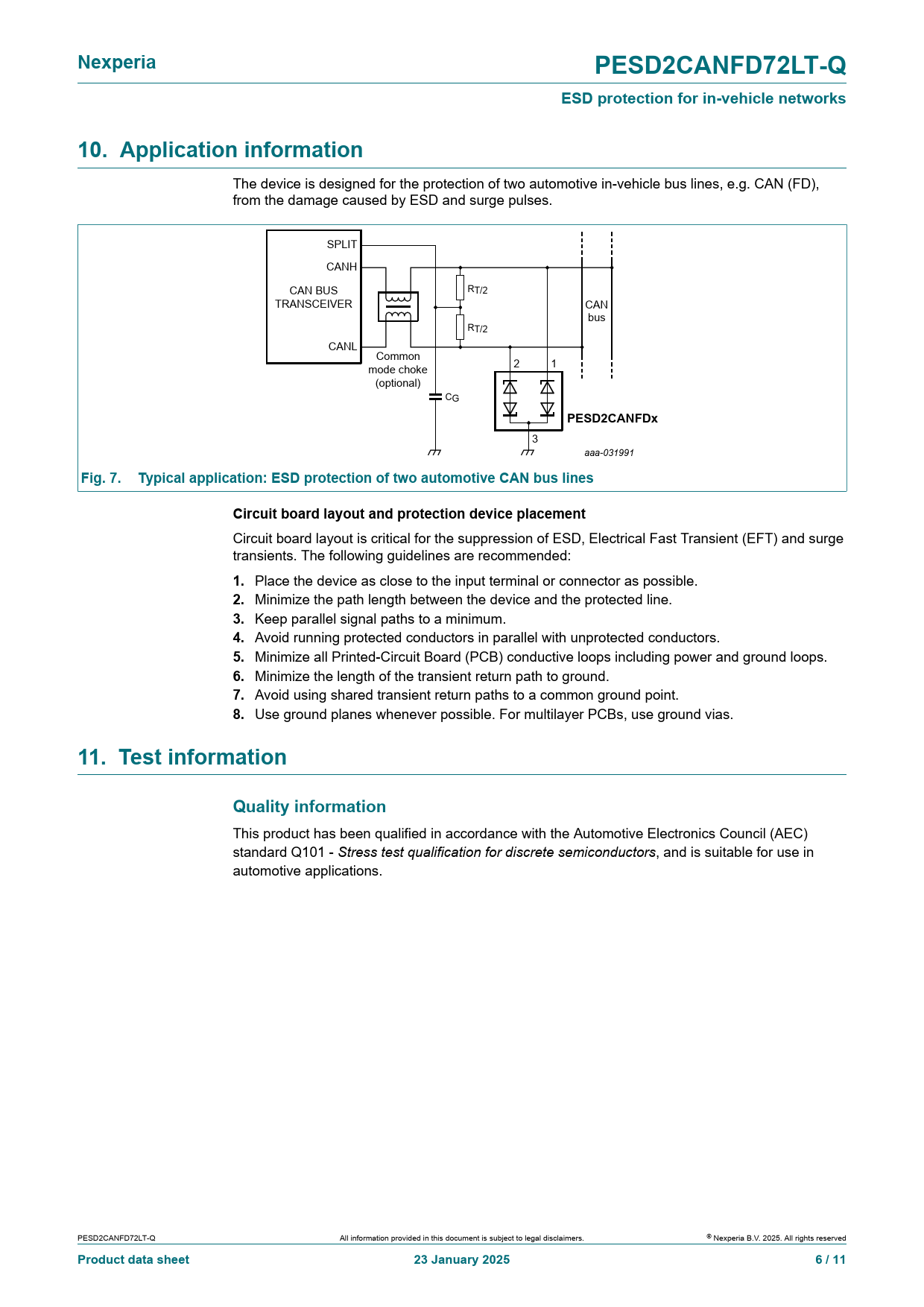 This product has been qualified in accordance with the Automotive Electronics Council (AEC) standard Q101 - Stress test qualification for discrete semiconductors, and is suitable for use in automotive applications. PESD2CANFD72LT-Q All information provided in this document is subject to legal disclaimers. © Nexperia B.V. 2025. Al rights reserved