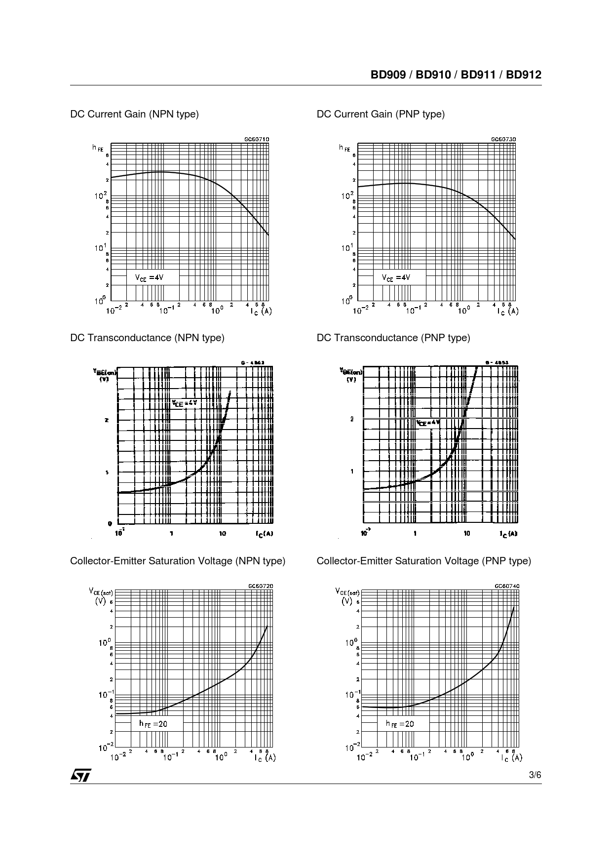 DC Current Gain (NPN type) DC Current Gain (PNP type) DC Transconductance (NPN type) DC Transconductance (PNP type) Collector-Emitter Saturation Voltage (NPN type) Collector-Emitter Saturation Voltage (PNP type) 3/6