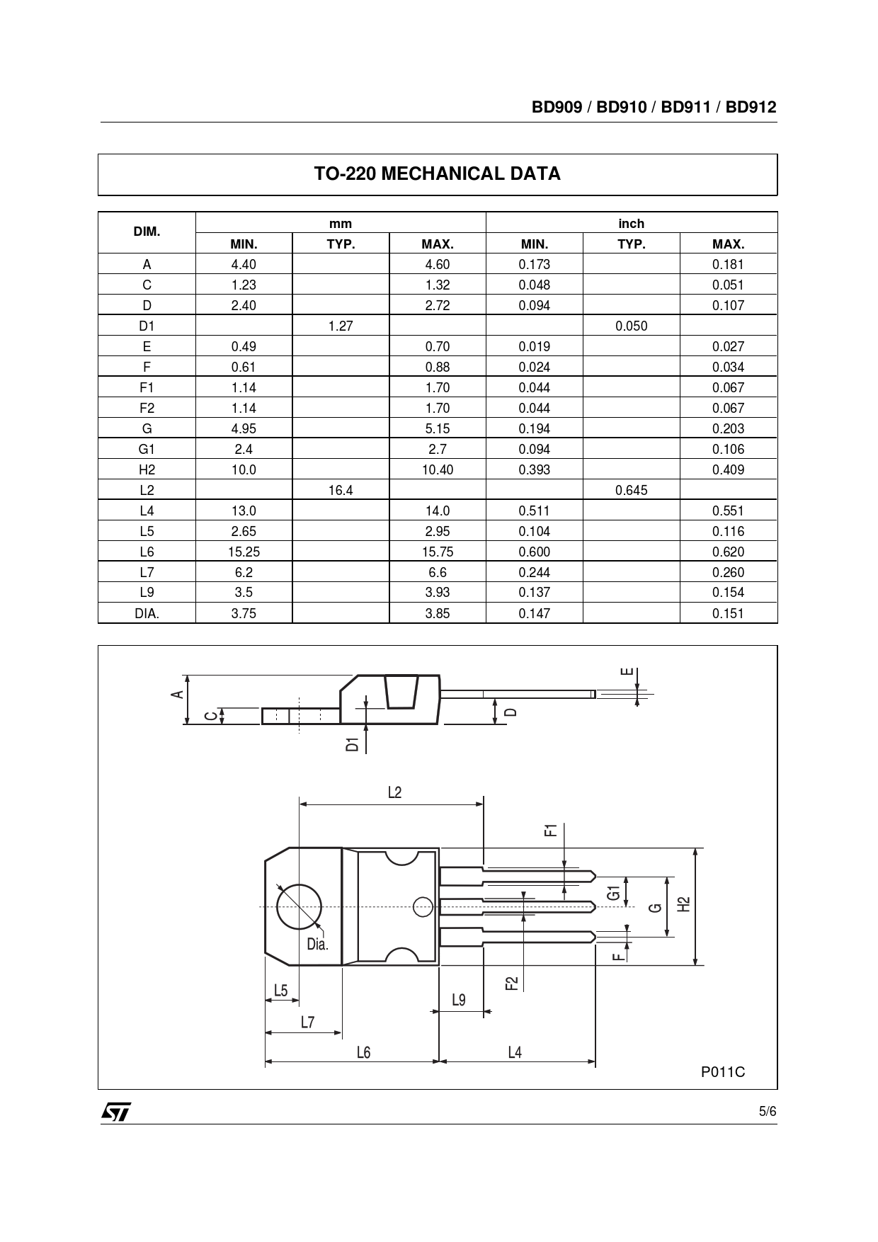 A 4.40 4.60 0.173 0.181 C 1.23 1.32 0.048 0.051 D 2.40 2.72 0.094 0.107 D1 1.27 0.050 E 0.49 0.70 0.019 0.027 F 0.61 0.88 0.024 0.034 F1 1.14 1.70 0.044 0.067 F2 1.14 1.70 0.044 0.067 G 4.95 5.15 0.194 0.203 G1 2.4 2.7 0.094 0.106 H2 10.0 10.40 0.393 0.409 L2 16.4 0.645 L4 13.0 14.0 0.511 0.551 L5 2.65 2.95 0.104 0.116 L6 15.25 15.75 0.600 0.620 L7 6.2 6.6 0.244 0.260 L9 3.5 3.93 0.137 0.154 DIA. 3.75 3.85 0.147 0.151 P011C 5/6
