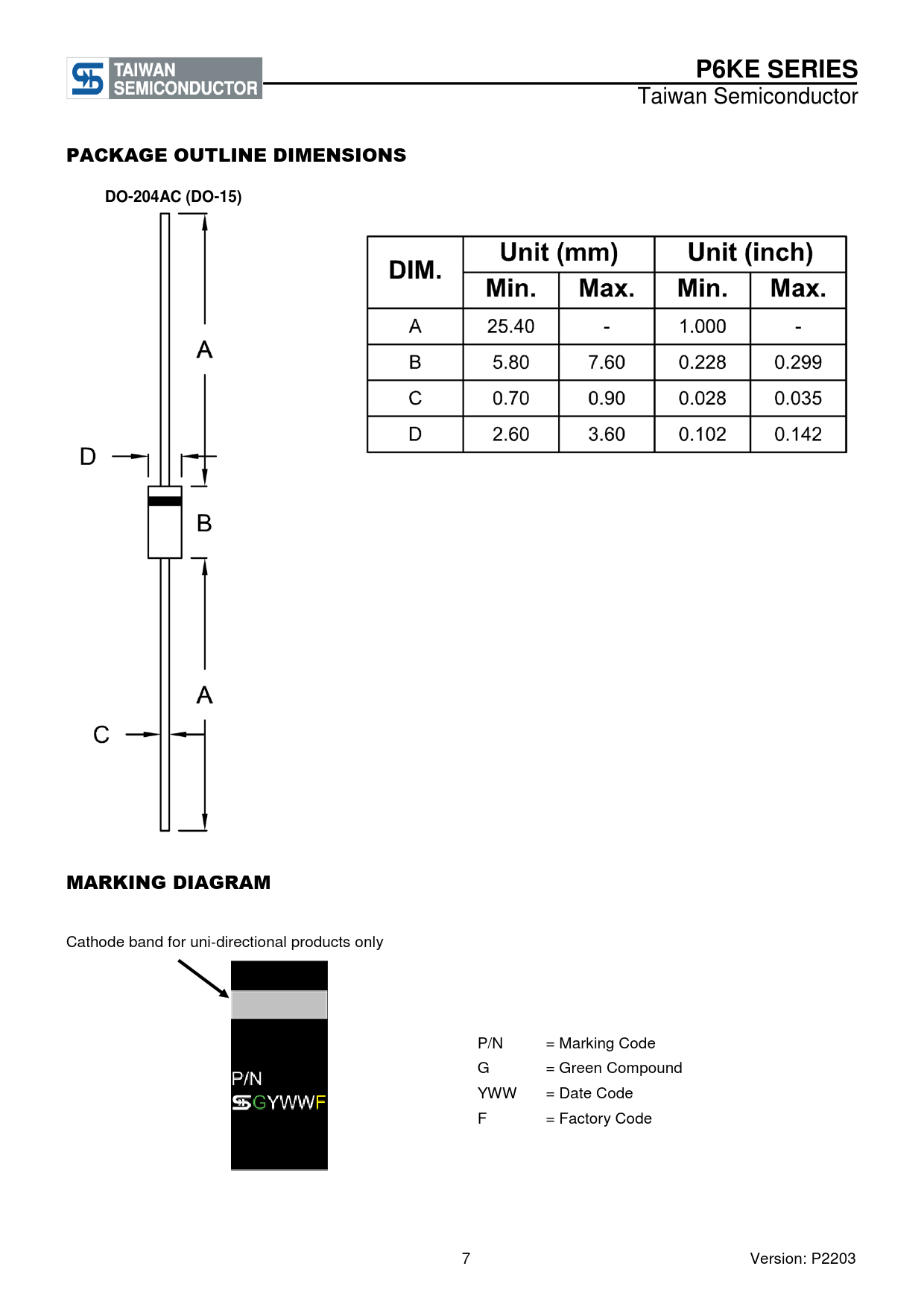 Cathode band for uni-directional products only P/N = Marking Code G = Green Compound YWW = Date Code F = Factory Code 7 Version: P2203