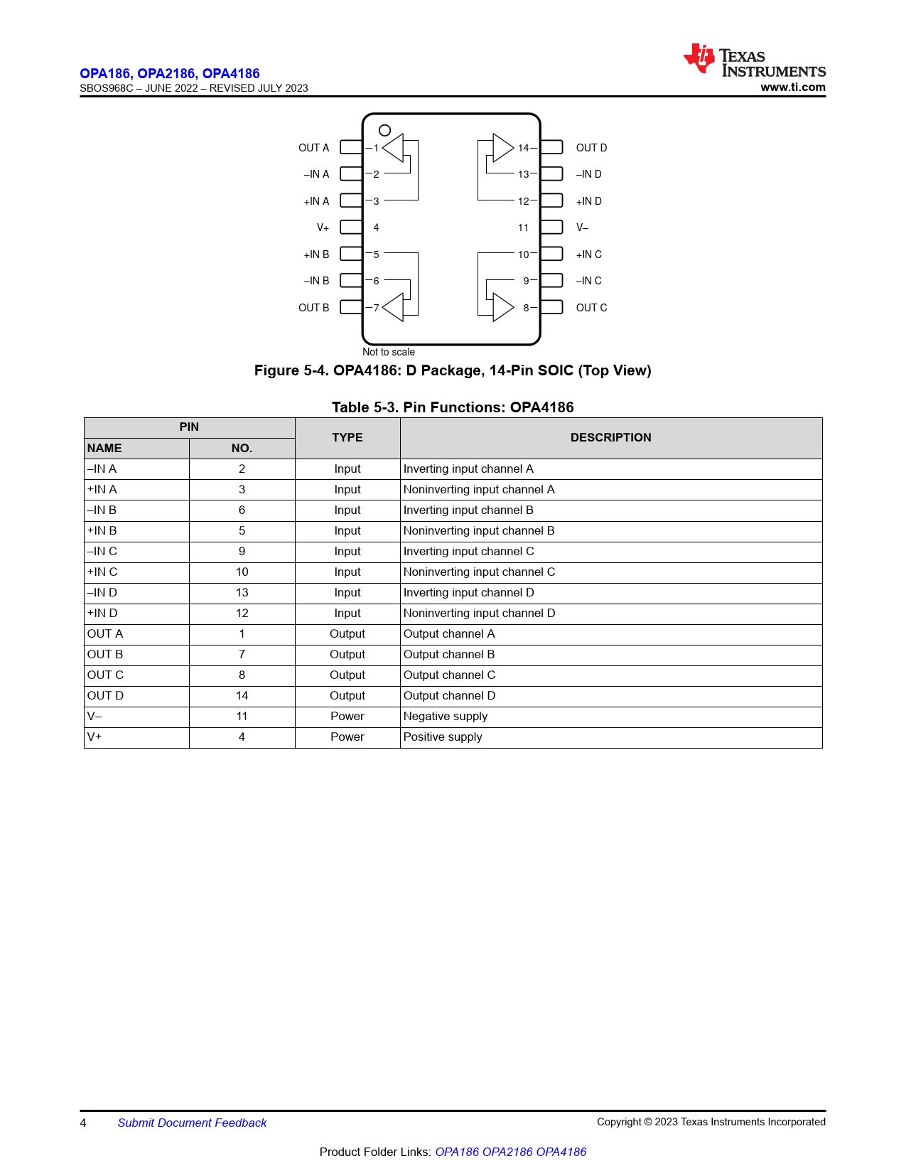 Figure 5-4. OPA4186: D Package, 14-Pin SOIC (Top View) Table 5-3. Pin Functions: OPA4186 PIN TYPE DESCRIPTION NAME NO.