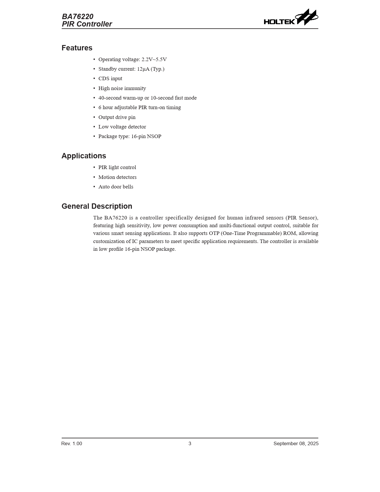 The BA76220 is a controller specifically designed for human infrared sensors (PIR Sensor), featuring high sensitivity, low power consumption and multi-functional output control, suitable for various smart sensing applications. It also supports OTP (One-Time Programmable) ROM, allowing customization of IC parameters to meet specific application requirements. The controller is available in low profile 16-pin NSOP package. Rev. 1.00 3 September 08, 2025 Document Outline Features Applications General Description Block Diagram Pin Assignment Pin Description Absolute Maximum Ratings Electrical Characteristics Functional Description TEST SC DT MODE CDS OUTPUT LVD Trigger Timing Retrigger LVD & CDS Detect Circuit The Criterion of LVD and CDS The Criterion of MODE Conditions for Disabling the PIR Amplifier Circuit Selection of OSC or DT Write ROM & Data Updated Communication Write/Read Value Protocol Registers PIR Amplifier Power-on Flow Application Circuits OTP-based Application Circuit RC-based Application Circuit Package Information 16-pin NSOP (150mil) Outline Dimensions