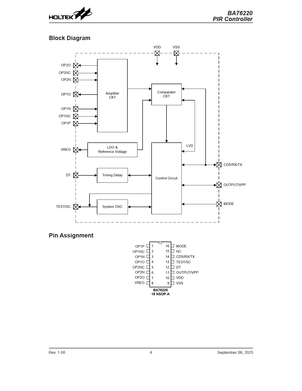 Rev. 1.00 4 September 08, 2025 Document Outline Features Applications General Description Block Diagram Pin Assignment Pin Description Absolute Maximum Ratings Electrical Characteristics Functional Description TEST SC DT MODE CDS OUTPUT LVD Trigger Timing Retrigger LVD & CDS Detect Circuit The Criterion of LVD and CDS The Criterion of MODE Conditions for Disabling the PIR Amplifier Circuit Selection of OSC or DT Write ROM & Data Updated Communication Write/Read Value Protocol Registers PIR Amplifier Power-on Flow Application Circuits OTP-based Application Circuit RC-based Application Circuit Package Information 16-pin NSOP (150mil) Outline Dimensions