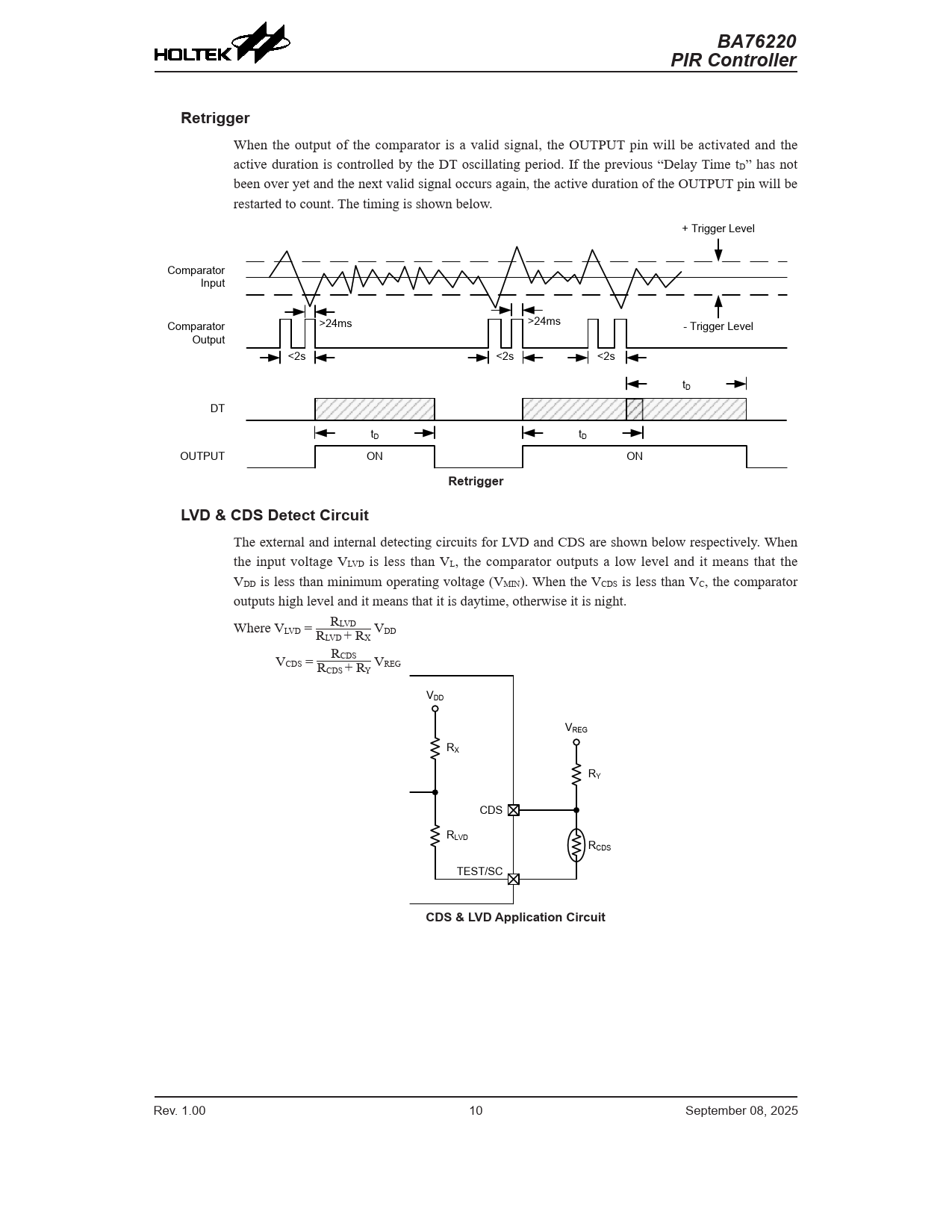 BA76220PIR ControllerRetrigger When the output of the comparator is a valid signal, the OUTPUT pin will be activated and the active duration is controlled by the DT oscillating period. If the previous “Delay Time tD” has not been over yet and the next valid signal occurs again, the active duration of the OUTPUT pin will be restarted to count. The timing is shown below. + Trigger Level Comparator Input Comparator >24ms >24ms - Trigger Level Output <2s <2s <2s tD DT tD tD OUTPUT ON ON RetriggerLVD & CDS Detect Circuit The external and internal detecting circuits for LVD and CDS are shown below respectively. When the input voltage VLVD is less than VL, the comparator outputs a low level and it means that the VDD is less than minimum operating voltage (VMIN). When the VCDS is less than VC, the comparator outputs high level and it means that it is daytime, otherwise it is night. Where VLVD = RLVD R VDD LVD + RX VCDS = RCDS R VREG CDS + RY VDD VREG RX RY CDS RLVD RCDS TEST/SC CDS & LVD Application Circuit Rev. 1.00 10 September 08, 2025 Document Outline Features Applications General Description Block Diagram Pin Assignment Pin Description Absolute Maximum Ratings Electrical Characteristics Functional Description TEST SC DT MODE CDS OUTPUT LVD Trigger Timing Retrigger LVD & CDS Detect Circuit The Criterion of LVD and CDS The Criterion of MODE Conditions for Disabling the PIR Amplifier Circuit Selection of OSC or DT Write ROM & Data Updated Communication Write/Read Value Protocol Registers PIR Amplifier Power-on Flow Application Circuits OTP-based Application Circuit RC-based Application Circuit Package Information 16-pin NSOP (150mil) Outline Dimensions