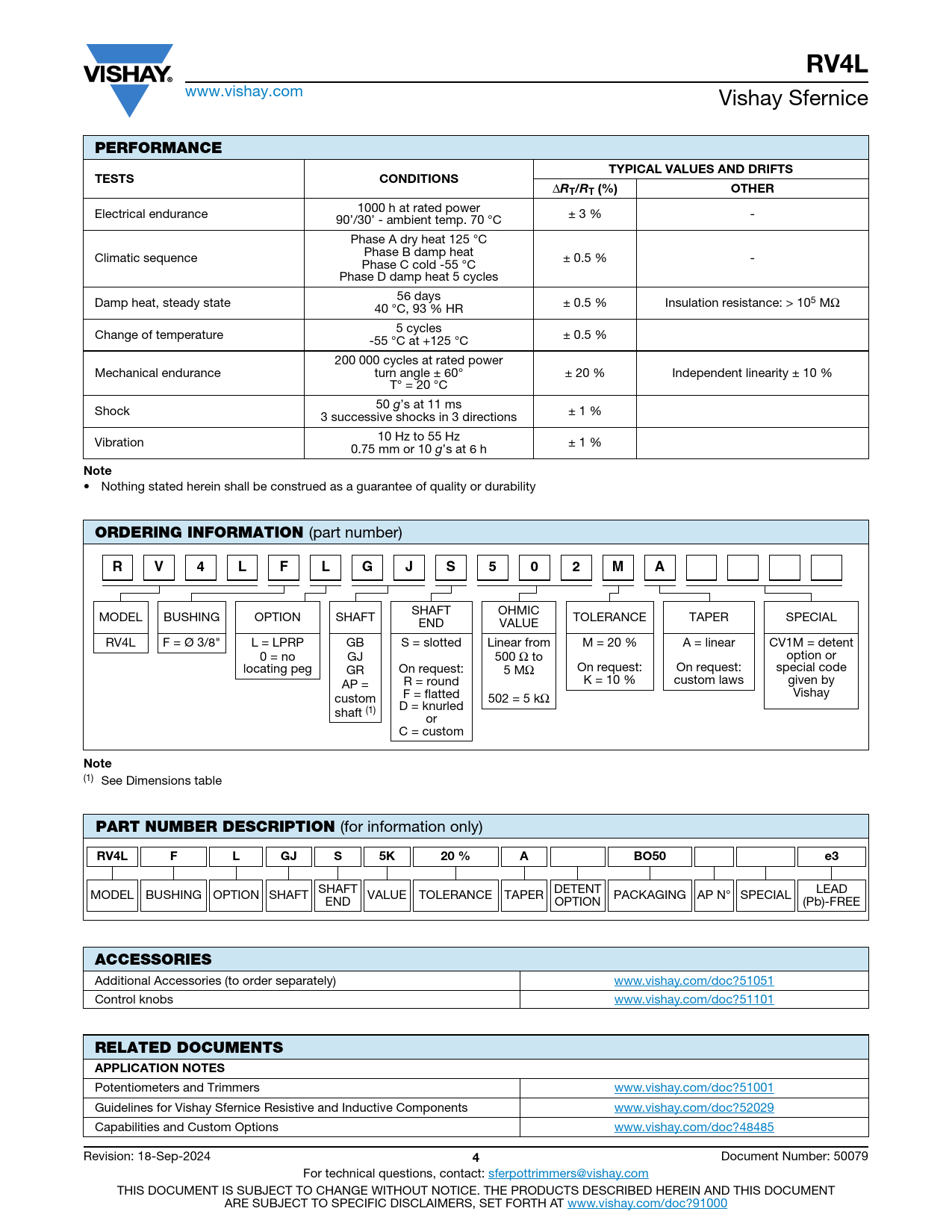 RV4L www.vishay.com Vishay Sfernice PERFORMANCETYPICAL VALUES AND DRIFTSTESTSCONDITIONS Δ RT/RT (%)OTHER 1000 h at rated power Electrical endurance ± 3 % - 90’/30’ - ambient temp. 70 °C Phase A dry heat 125 °C Phase B damp heat Climatic sequence ± 0.5 % - Phase C cold -55 °C Phase D damp heat 5 cycles 56 days Damp heat, steady state ± 0.5 % Insulation resistance: > 105 MΩ 40 °C, 93 % HR 5 cycles Change of temperature ± 0.5 % -55 °C at +125 °C 200 000 cycles at rated power Mechanical endurance turn angle ± 60° ± 20 % Independent linearity ± 10 % T° = 20 °C 50 g’s at 11 ms Shock ± 1 % 3 successive shocks in 3 directions 10 Hz to 55 Hz Vibration ± 1 % 0.75 mm or 10 g’s at 6 h Note • Nothing stated herein shall be construed as a guarantee of quality or durability ORDERING INFORMATION (part number) RV4LFLGJS502MA SHAFT OHMIC MODEL BUSHING OPTION SHAFT TOLERANCE TAPER SPECIAL END VALUE RV4L F = Ø 3/8" L = LPRP GB S = slotted Linear from M = 20 % A = linear CV1M = detent 0 = no GJ 500 Ω to option or locating peg GR On request: 5 MΩ On request: On request: special code AP = R = round K = 10 % custom laws given by Vishay custom F = flatted 502 = 5 kΩ D = knurled shaft (1) or C = custom Note (1) See Dimensions table PART NUMBER DESCRIPTION (for information only) RV4LFLGJS5K20 %ABO50e3 SHAFT DETENT LEAD MODEL BUSHING OPTION SHAFT VALUE TOLERANCE TAPER PACKAGING AP N° SPECIAL END OPTION (Pb)-FREE ACCESSORIES Additional Accessories (to order separately) www.vishay.com/doc?51051 Control knobs www.vishay.com/doc?51101 RELATED DOCUMENTS APPLICATION NOTES Potentiometers and Trimmers www.vishay.com/doc?51001 Guidelines for Vishay Sfernice Resistive and Inductive Components www.vishay.com/doc?52029 Capabilities and Custom Options www.vishay.com/doc?48485 Revision: 18-Sep-2024 4 Document Number: 50079 For technical questions, contact: sferpottrimmers@vishay.com THIS DOCUMENT IS SUBJECT TO CHANGE WITHOUT NOTICE. THE PRODUCTS DESCRIBED HEREIN AND THIS DOCUMENT ARE SUBJECT TO SPECIFIC DISCLAIMERS, SET FORTH AT www.vishay.com/doc?91000