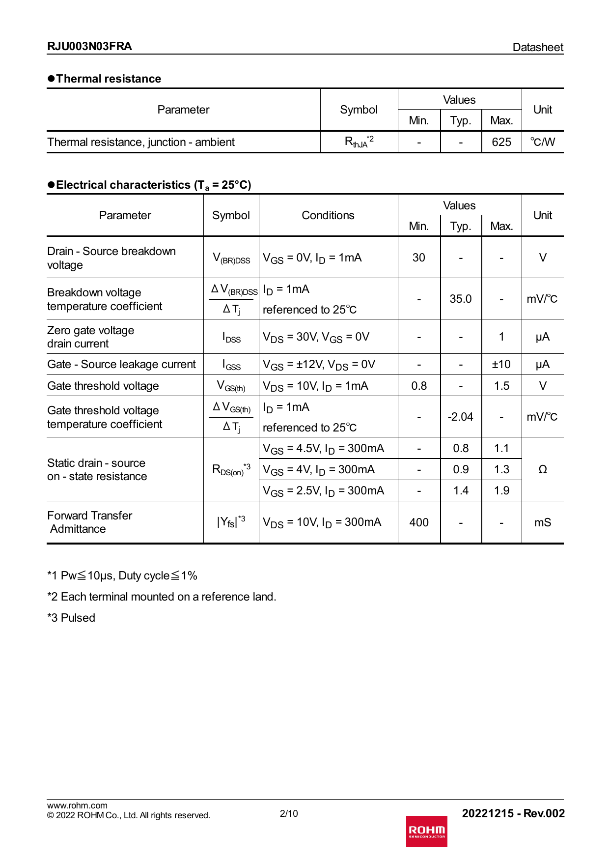 RJU003N03FRA. Thermal resistance. Electrical characteristics (Ta = 25°C). 20221215 - Rev.002