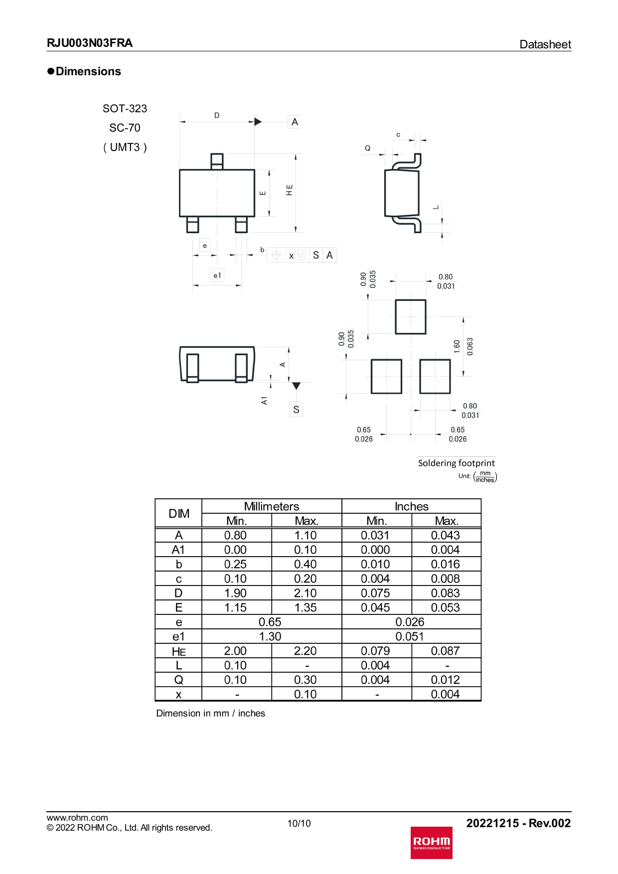 | Páginas / Página | 13 / 10 — RJU003N03FRA. Dimensions. 20221215 - Rev.002 |