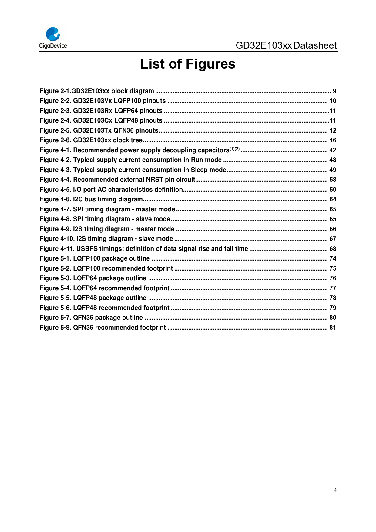 List of Figures Figure 2-1.GD32E103xx block diagram ... 9 Figure 2-2. GD32E103Vx LQFP100 pinouts .. 10 Figure 2-3. GD32E103Rx LQFP64 pinouts ... 11 Figure 2-4. GD32E103Cx LQFP48 pinouts ... 11 Figure 2-5. GD32E103Tx QFN36 pinouts ... 12 Figure 2-6. GD32E103xx clock tree .. 16 Figure 4-1. Recommended power supply decoupling capacitors(1)(2) .. 42 Figure 4-2. Typical supply current consumption in Run mode .. 48 Figure 4-3. Typical supply current consumption in Sleep mode .. 49 Figure 4-4. Recommended external NRST pin circuit.. 58 Figure 4-5. I/O port AC characteristics definition ... 59 Figure 4-6. I2C bus timing diagram.. 64 Figure 4-7. SPI timing diagram - master mode ... 65 Figure 4-8. SPI timing diagram - slave mode .. 65 Figure 4-9. I2S timing diagram - master mode ... 66 Figure 4-10. I2S timing diagram - slave mode .. 67 Figure 4-11. USBFS timings: definition of data signal rise and fall time ... 68 Figure 5-1. LQFP100 package outline ... 74 Figure 5-2. LQFP100 recommended footprint .. 75 Figure 5-3. LQFP64 package outline ... 76 Figure 5-4. LQFP64 recommended footprint .. 77 Figure 5-5. LQFP48 package outline ... 78 Figure 5-6. LQFP48 recommended footprint .. 79 Figure 5-7. QFN36 package outline ... 80 Figure 5-8. QFN36 recommended footprint .. 81