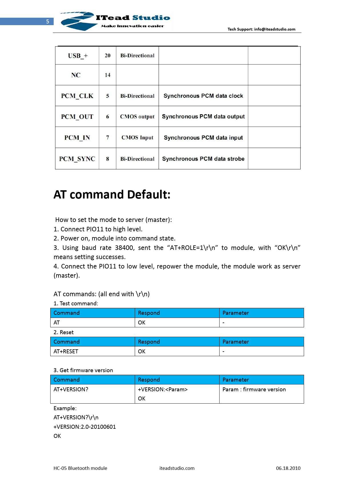 How to set the mode to server (master): 1. Connect PIO11 to high level. 2. Power on, module into command state. 3. Using baud rate 38400, sent the “AT+ROLE=1\r\n” to module, with “OK\r\n” means setting successes. 4. Connect the PIO11 to low level, repower the module, the module work as server (master). AT commands: (all end with \r\n) 1. Test command: Command Respond Parameter AT OK - 2. Reset Command Respond Parameter AT+RESET OK - 3. Get firmware version Command Respond Parameter AT+VERSION? +VERSION:<Param> Param : firmware version OK Example: AT+VERSION?\r\n +VERSION:2.0-20100601 OK HC-05 Bluetooth module iteadstudio.com 06.18.2010