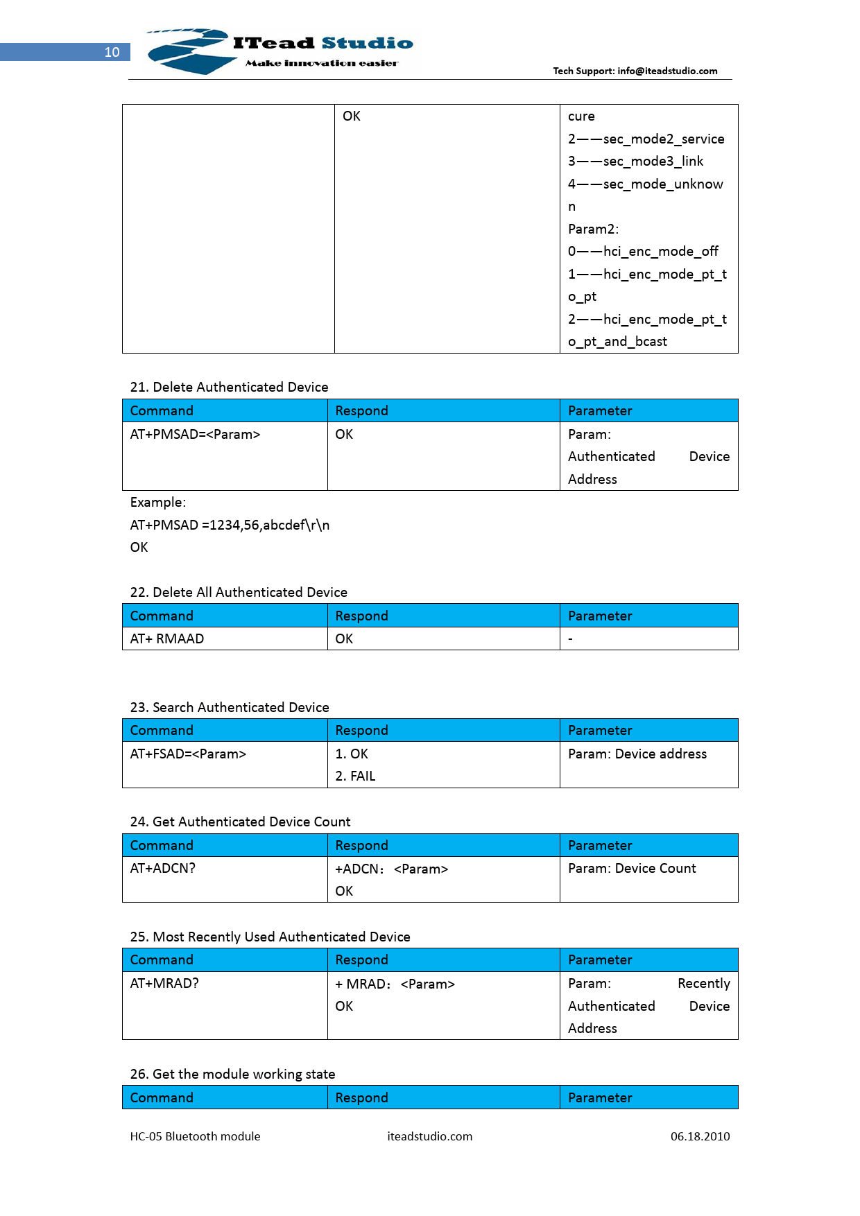 OK cure 2——sec_mode2_service 3——sec_mode3_link 4——sec_mode_unknow n Param2: 0——hci_enc_mode_off 1——hci_enc_mode_pt_t o_pt 2——hci_enc_mode_pt_t o_pt_and_bcast 21. Delete Authenticated Device Command Respond Parameter AT+PMSAD=<Param> OK Param: Authenticated Device Address Example: AT+PMSAD =1234,56,abcdef\r\n OK 22. Delete All Authenticated Device Command Respond Parameter AT+ RMAAD OK - 23. Search Authenticated Device Command Respond Parameter AT+FSAD=<Param> 1. OK Param: Device address 2. FAIL 24. Get Authenticated Device Count Command Respond Parameter AT+ADCN? +ADCN:<Param> Param: Device Count OK 25. Most Recently Used Authenticated Device Command Respond Parameter AT+MRAD? + MRAD:<Param> Param: Recently OK Authenticated Device Address 26. Get the module working state Command Respond Parameter HC-05 Bluetooth module iteadstudio.com 06.18.2010