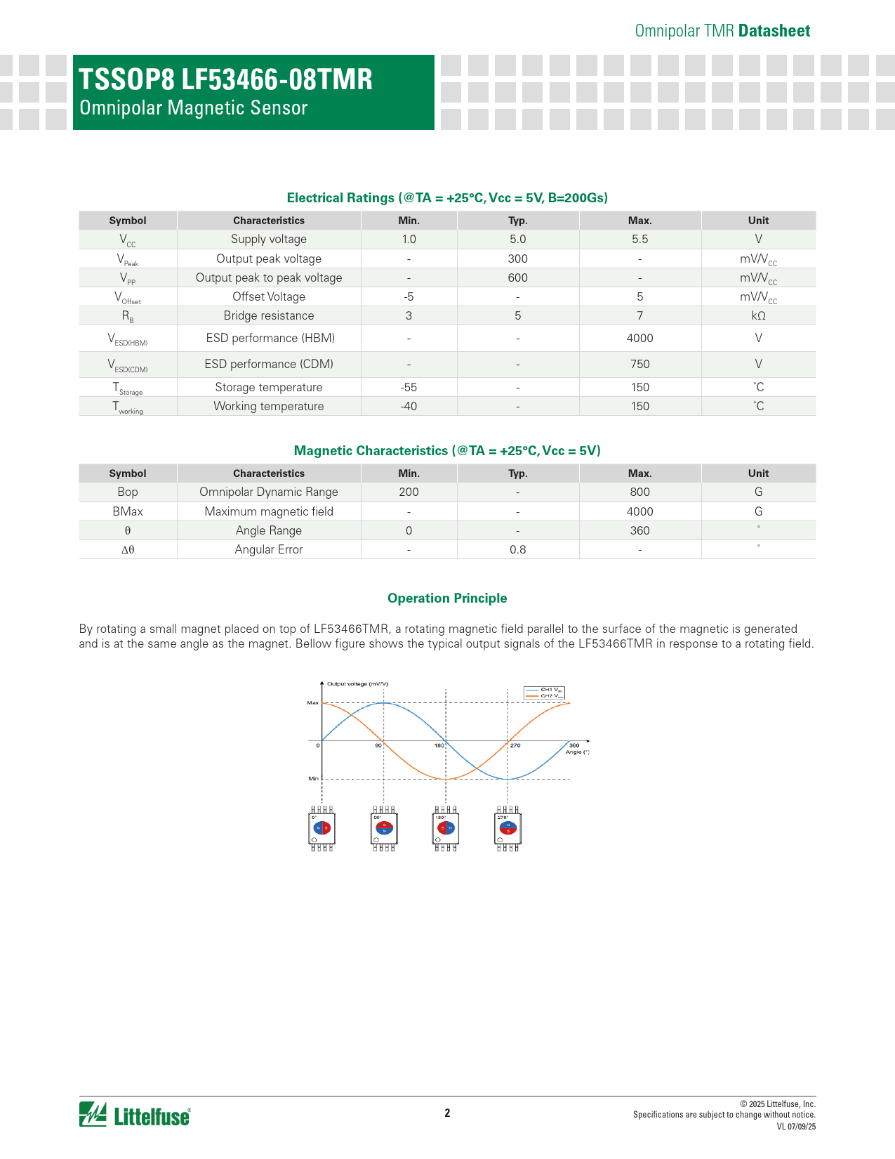 Datasheet. TSSOP8 LF53466-08TMR. Electrical Ratings (@TA = +25°C, Vcc = 5V, B=200Gs). Symbol. Characteristics. Min. Typ. Max. Unit