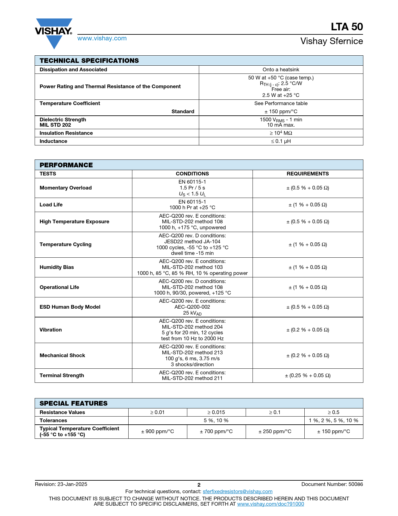 LTA 50 www.vishay.com Vishay Sfernice TECHNICAL SPECIFICATIONS Dissipation and Associated Onto a heatsink 50 W at +50 °C (case temp.) R Power Rating and Thermal Resistance of the Component TH (j - c): 2.5 °C/W Free air: 2.5 W at +25 °C Temperature Coefficient See Performance table Standard ± 150 ppm/°C Dielectric Strength 1500 VRMS - 1 min MIL STD 202 10 mA max. Insulation Resistance ≥ 104 MΩ Inductance ≤ 0.1 μH PERFORMANCE TESTSCONDITIONSREQUIREMENTS EN 60115-1 Momentary Overload 1.5 Pr / 5 s ± (0.5 % + 0.05 Ω) US < 1.5 UL EN 60115-1 Load Life ± (1 % + 0.05 Ω) 1000 h Pr at +25 °C AEC-Q200 rev. E conditions: High Temperature Exposure MIL-STD-202 method 108 ± (0.5 % + 0.05 Ω) 1000 h, +175 °C, unpowered AEC-Q200 rev. D conditions: JESD22 method JA-104 Temperature Cycling ± (1 % + 0.05 Ω) 1000 cycles, -55 °C to +125 °C dwell time -15 min AEC-Q200 rev. E conditions: Humidity Bias MIL-STD-202 method 103 ± (1 % + 0.05 Ω) 1000 h, 85 °C, 85 % RH, 10 % operating power AEC-Q200 rev. D conditions: Operational Life MIL-STD-202 method 108 ± (1 % + 0.05 Ω) 1000 h, 90/30, powered, +125 °C AEC-Q200 rev. E conditions: ESD Human Body Model AEC-Q200-002 ± (0.5 % + 0.05 Ω) 25 kVAD AEC-Q200 rev. E conditions: MIL-STD-202 method 204 Vibration ± (0.2 % + 0.05 Ω) 5 g’s for 20 min, 12 cycles test from 10 Hz to 2000 Hz AEC-Q200 rev. E conditions: MIL-STD-202 method 213 Mechanical Shock ± (0.2 % + 0.05 Ω) 100 g’s, 6 ms, 3.75 m/s 3 shocks/direction AEC-Q200 rev. E conditions: Terminal Strength ± (0.25 % + 0.05 Ω) MIL-STD-202 method 211 SPECIAL FEATURES Resistance Values ≥ 0.01 ≥ 0.015 ≥ 0.1 ≥ 0.5 Tolerances 5 %, 10 % 1 %, 2 %, 5 %, 10 % Typical Temperature Coefficient ± 900 ppm/°C ± 700 ppm/°C ± 250 ppm/°C ± 150 ppm/°C (-55 °C to +155 °C) Revision: 23-Jan-2025 2 Document Number: 50086 For technical questions, contact: sferfixedresistors@vishay.com THIS DOCUMENT IS SUBJECT TO CHANGE WITHOUT NOTICE. THE PRODUCTS DESCRIBED HEREIN AND THIS DOCUMENT ARE SUBJECT TO SPECIFIC DISCLAIMERS, SET FORTH AT www.vishay.com/doc?91000