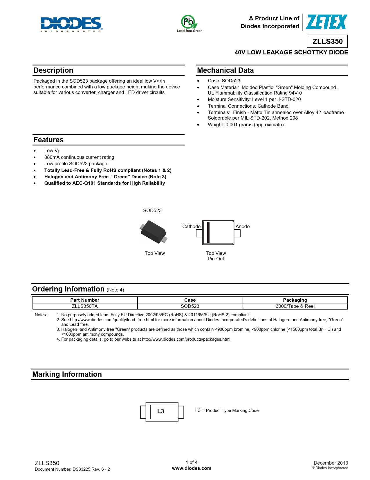 A Product Line of. Diodes Incorporated. ZLLS350. 40V LOW LEAKAGE SCHOTTKY DIODE. Description. Mechanical Data. Features