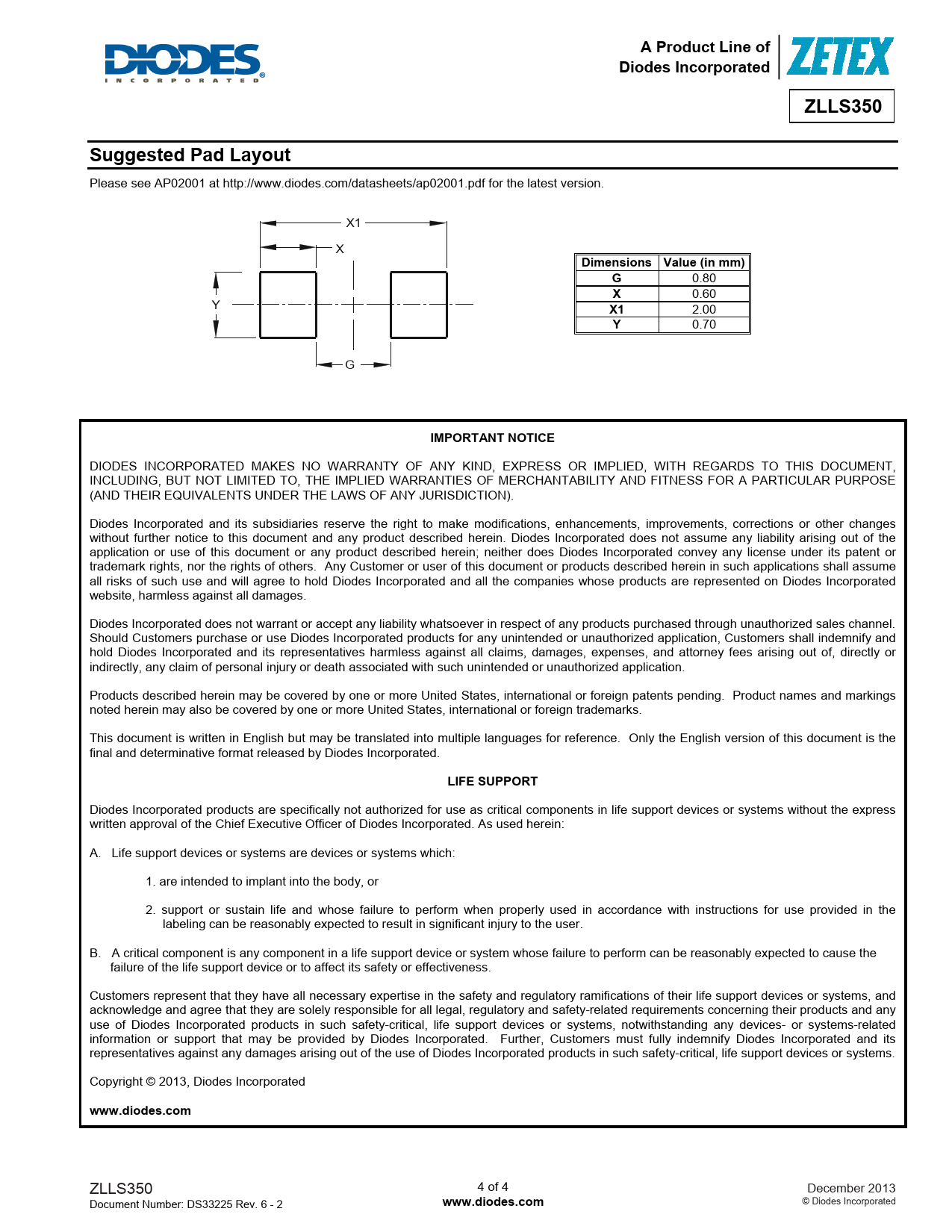 A Product Line of. Diodes Incorporated. ZLLS350. Suggested Pad Layout. Dimensions Value (in mm). IMPORTANT NOTICE. LIFE SUPPORT