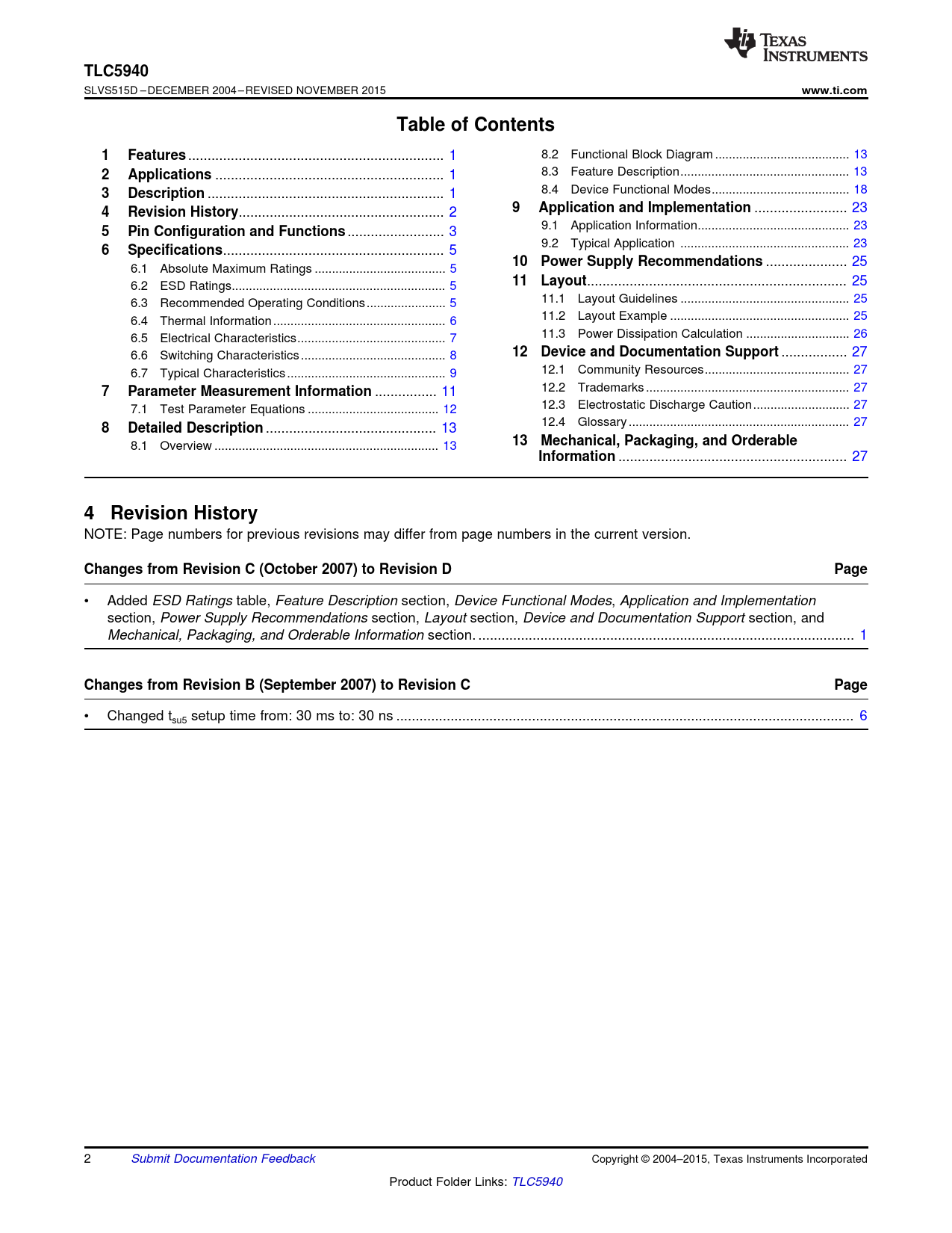 TLC5940. www.ti.com. Table of Contents. Features. Applications. Description. Application and Implementation. Revision History
